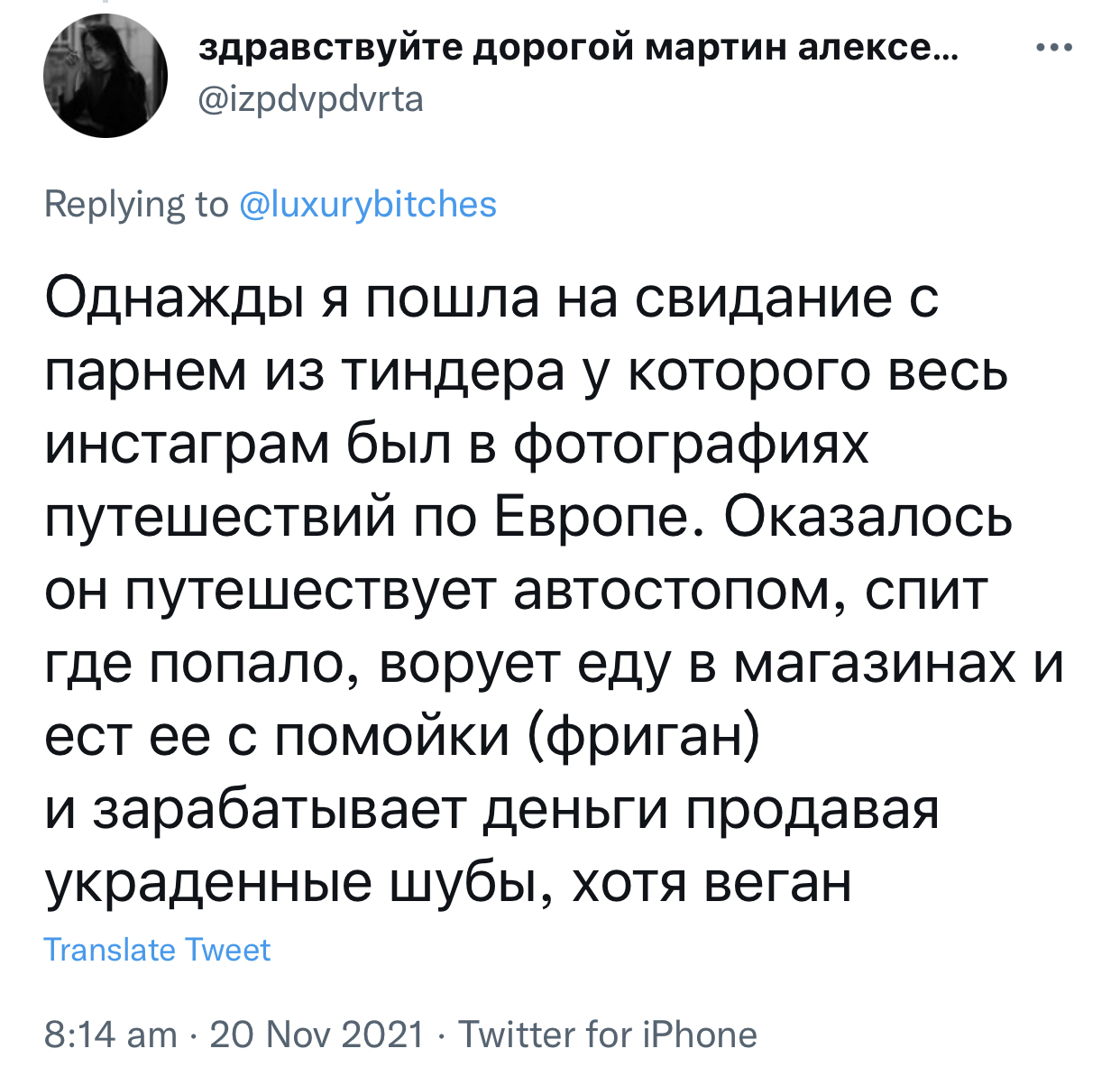 Вчера установила Тиндер и сегодня впервые была на свидании такого рода. Это было очень весело и интересно. У меня тревожное расстройство, у него биполярка, рыбак рыбака как говорится, обсудили всё: от Властелина Колец до антидепрессантов. Я думала, в нашем городке вообще там никто не сидит. Случайно зашли в кафе, а там скрипачка собралась играть, исполняла от классики до Короля и Шута. В общем, всё замечательно. Так что, там не одни озаботы сидят, которые первым делом спрашивают про размер груди (хотя и такое есть). Не знаю, что будет дальше, но всё равно встряхнулась, пообщалась, погуляла и поговорила по душам с хорошим парнем!
