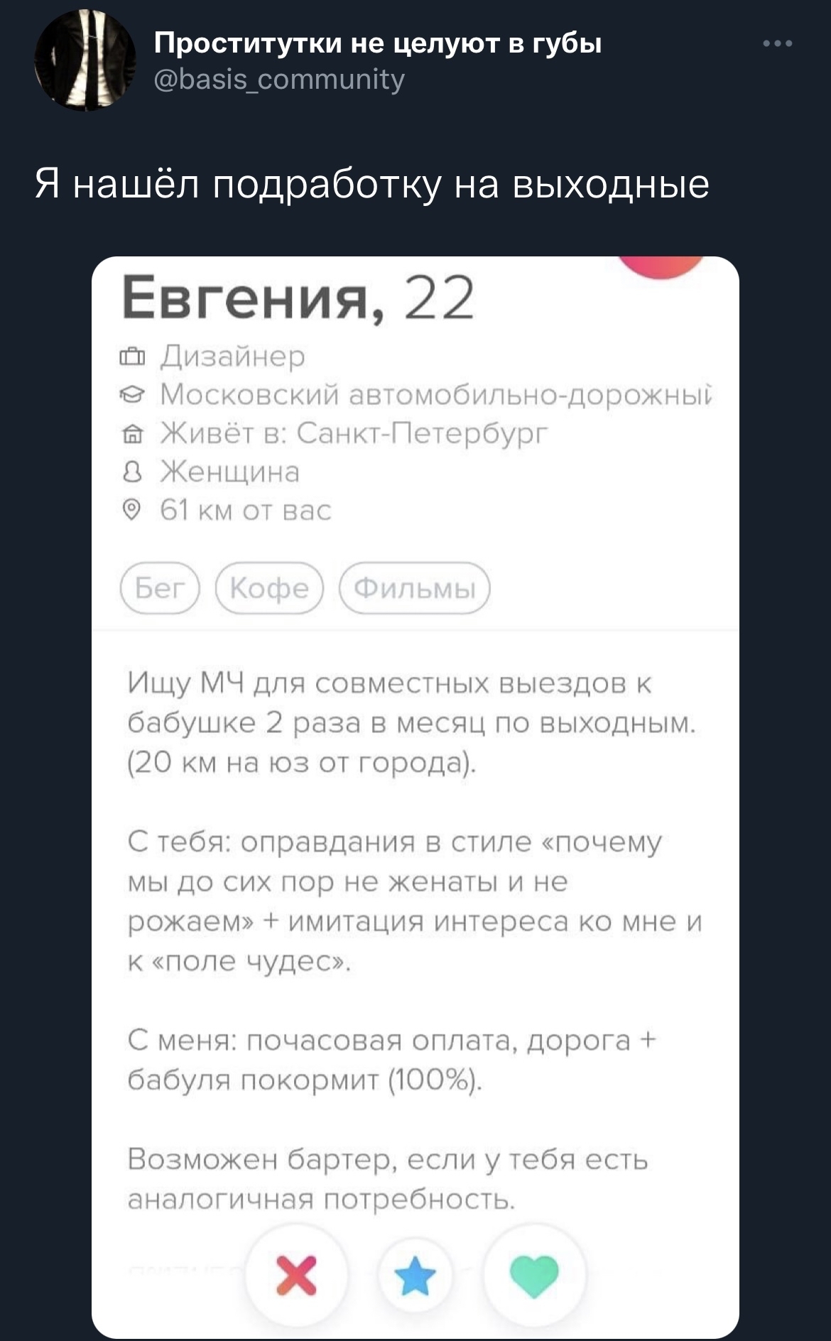 История моего знакомого. В Тиндере познакомился с девушкой. У обоих в анкете целью указан секс. Списались, созвонились. Едет к ней. Она его просит для стола купить каких-то продуктов. Он покупает. Она, мол чуть задерживаюсь, оставь сумку у консьержки, чтобы в руках не мусолить тяжелое. Он оставляет. Ждёт. Девушка пропала. Приходит к консьержке, а та говорит, что продукты мужик какой-то забрал.