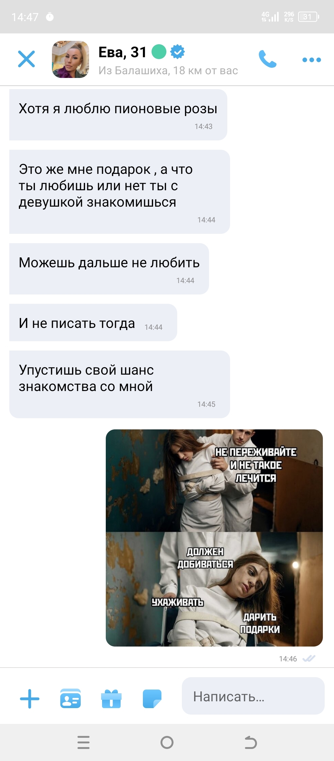 Первая встреча. Стою в условном месте и жду ее. Смотрю, вдалеке вроде она идет, но с какой-то женщиной. Думаю "может пристал кто по дороге?" Строю план, как по-рыцарски буду спасать ее и сразу получу задел на отличное свидание.