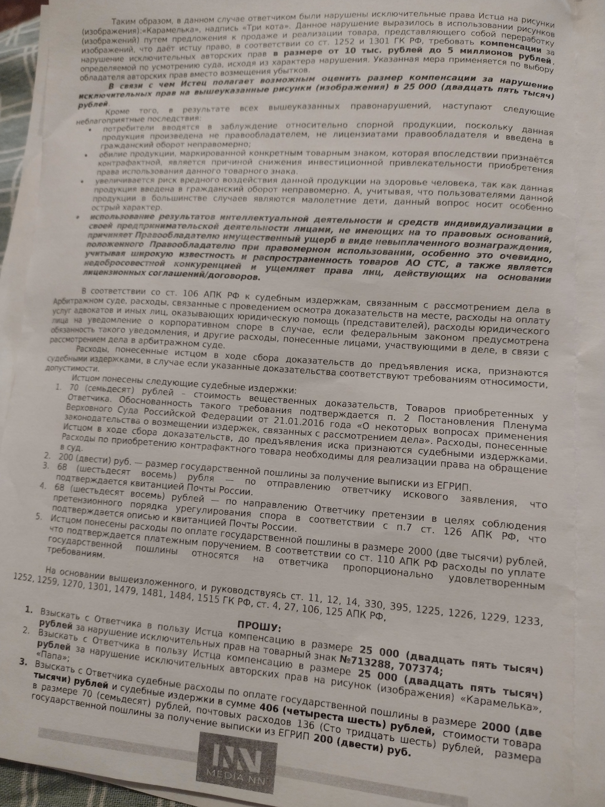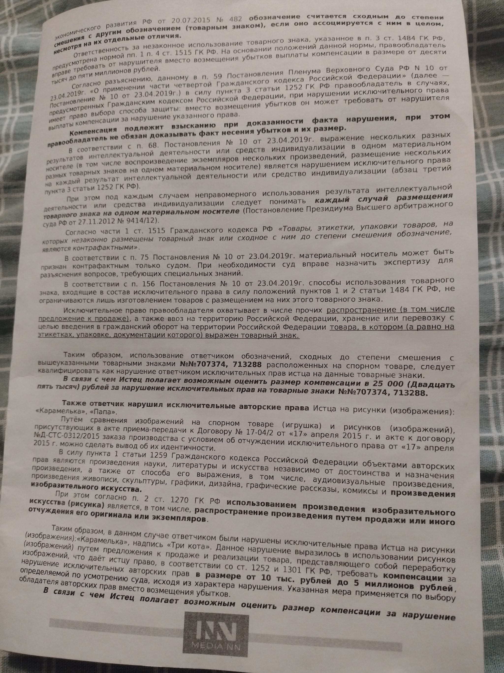 В пред. посте описано, что со мной после резонанса на пикабу связался представитель Медиа-нн, предложил оплатить только понесенные расходы в связи с нестандартностью ситуации, как я понял (продажа б/у игрушки). Я все же отказался, т к не считаю себя виновным, я посредник, продаю игрушки от частных лиц, лицензионность игрушки проверить не могу (ярлыки, подставки, например,на которых могут быть клейма, на игрушках б/у часто отсутствуют, упаковка тем более). Детей нет, современные мультики не знаю особо, так что обычно не могу понять - просто это игрушка котика, или игрушка по мультику