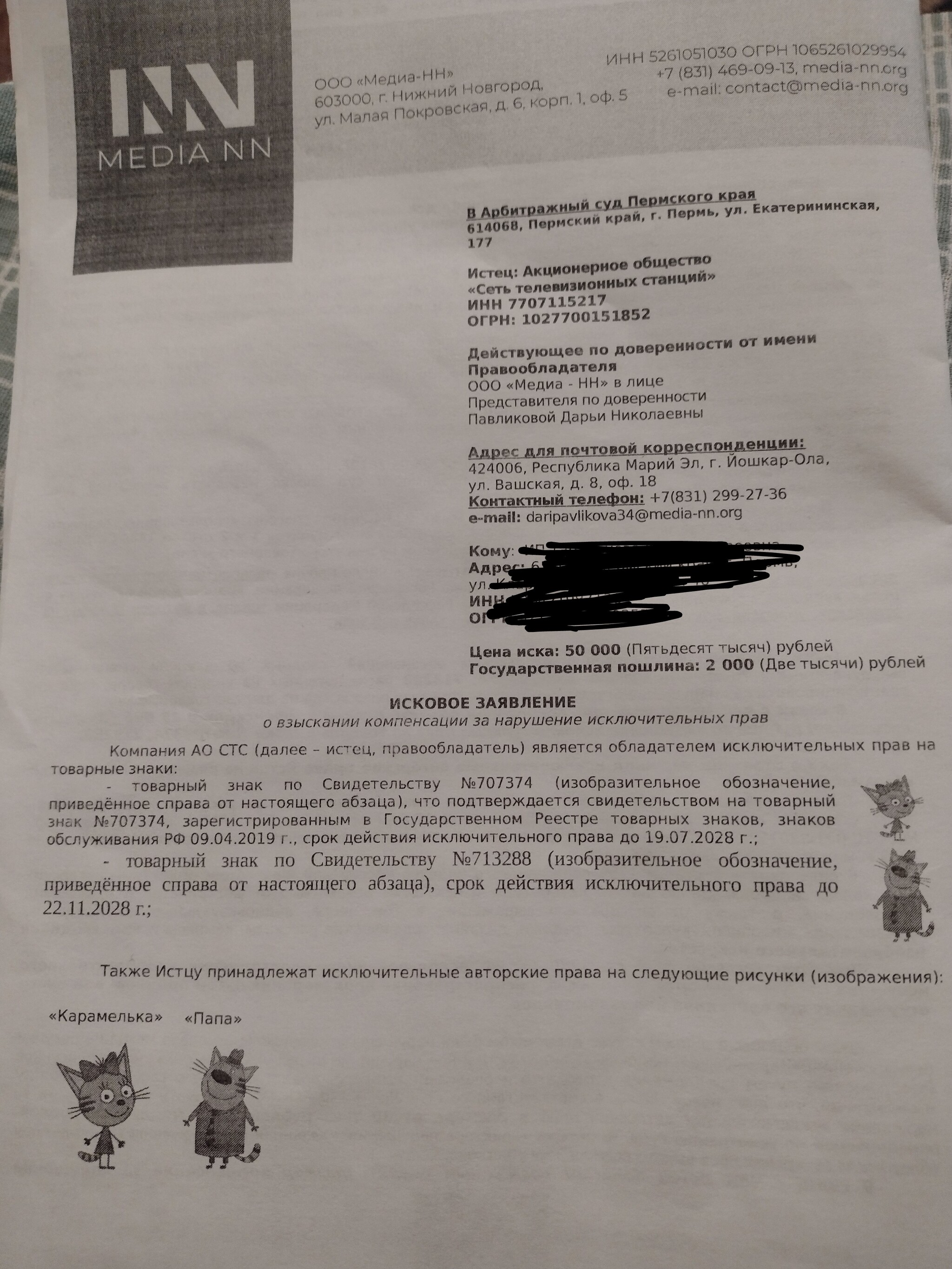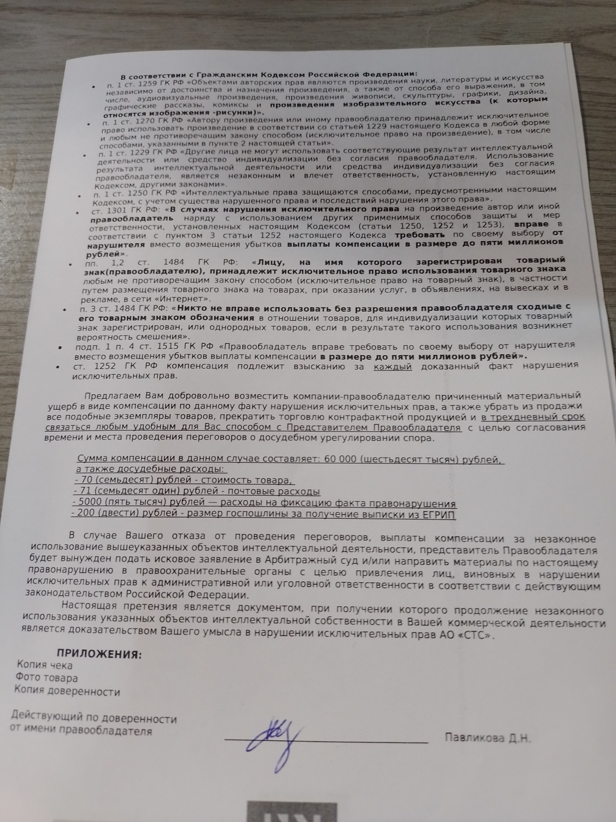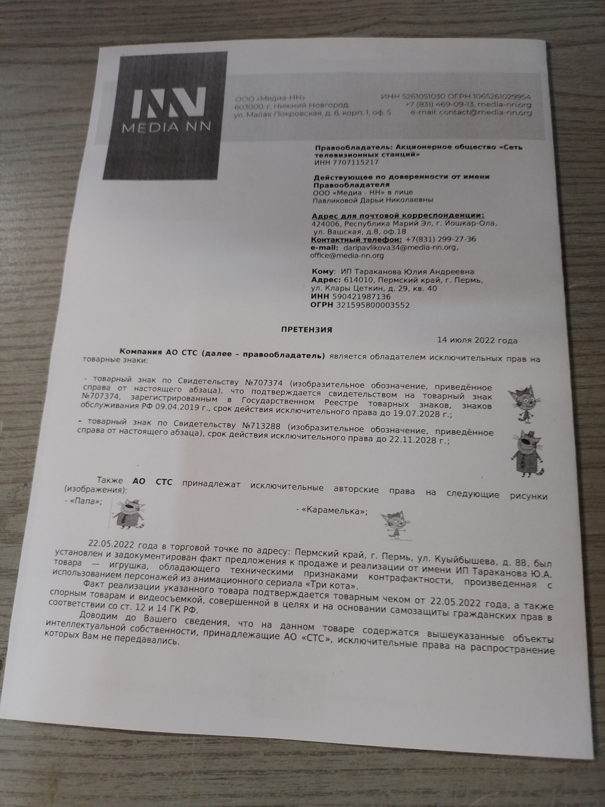 Сегодня пришло две претензии на авторское право за продажу четырех б/у (!) игрушек по 35 рэ. Два Фиксика и два персонажа из Трёх котов. Этим я нанес ущерб около 140 тысяч СТС, о чем мне сообщили в заказных письмах.
