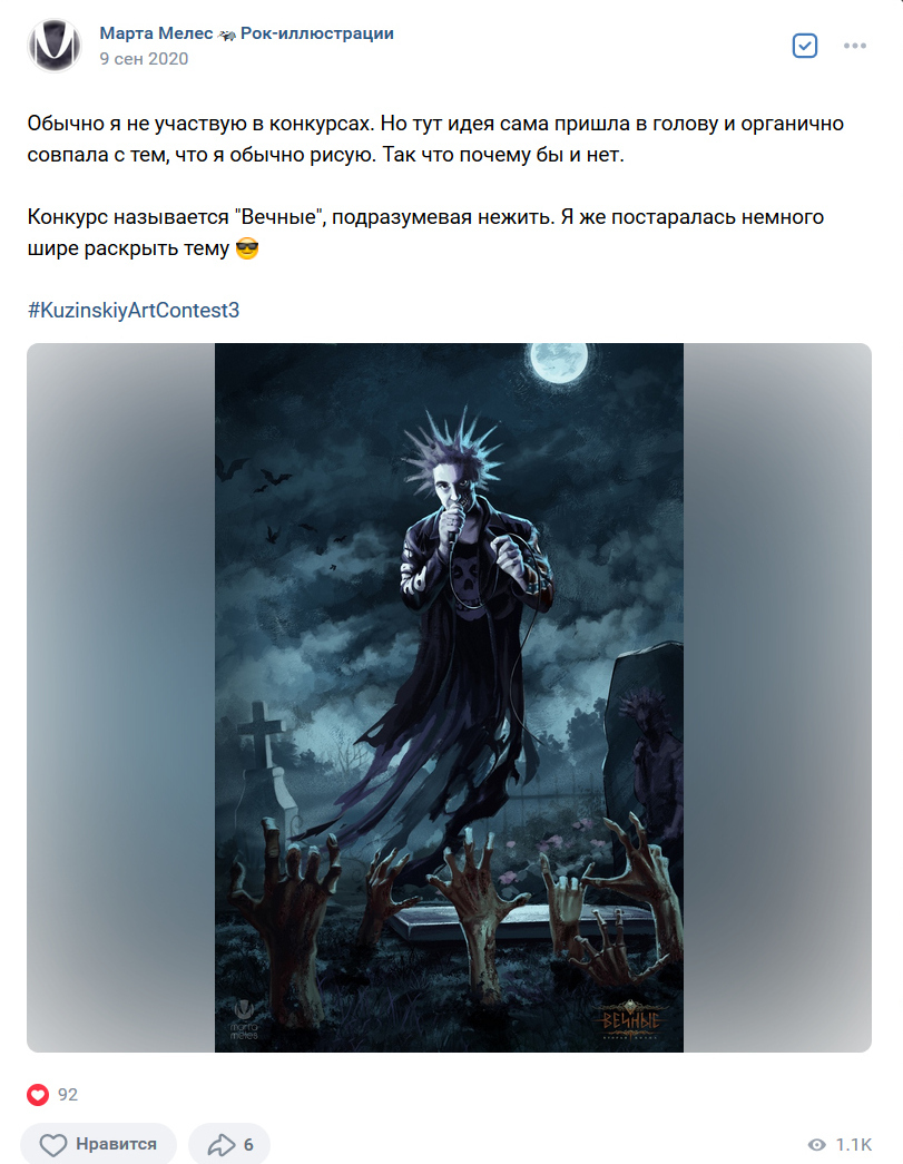 В августе 2020-го года в сообществе ВК Kuzinskiy Art объявили конкурс рисунков на тему нежити под названием «Вечные». Я посидела, пораскинула мозгами, придумала эту идею и изобразила её.