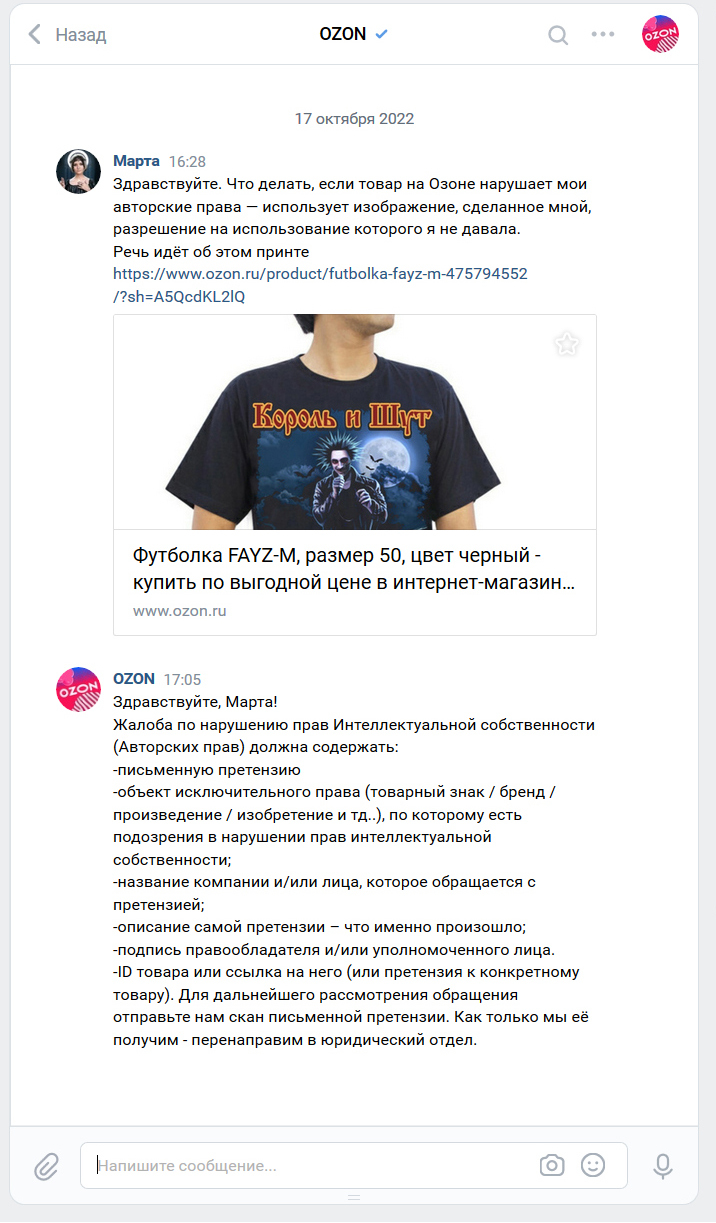 Первым делом я, конечно, написала в техподдержку Озона. Ответ, прямо скажем, удивил. Мне прямым текстом заявили: отправляйте досудебную претензию.