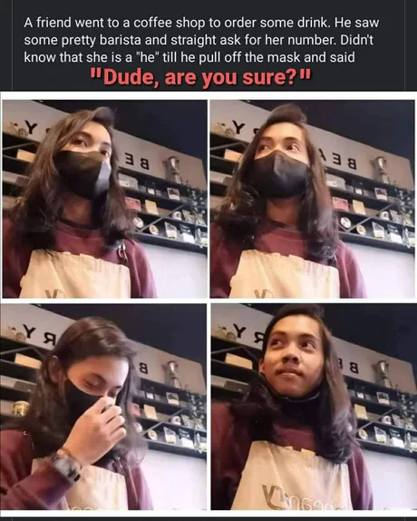 Приятель зашёл в кофейню, заказал напиток. Он заметил симпатичную баристу в маске и попросил её номер.Он понял, что это не она, а он, только когда тот приспустил маску и спросил: