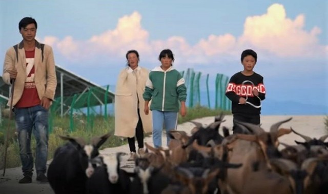 Папа, мама, сестра и Ванг перегоняют своих коз.