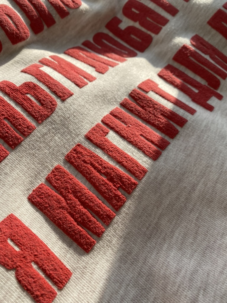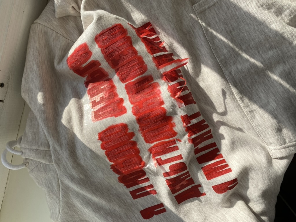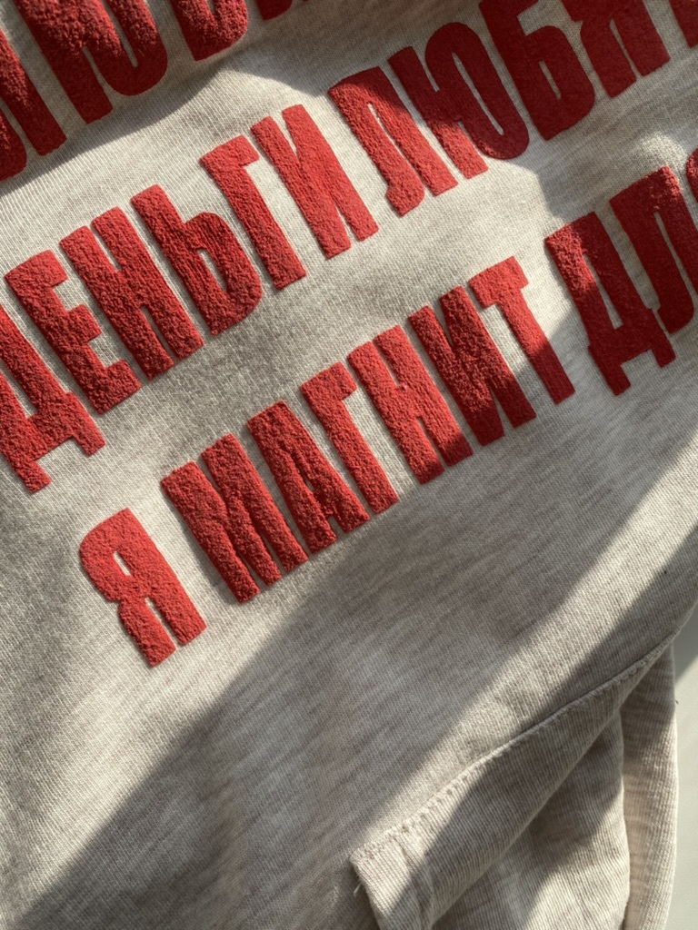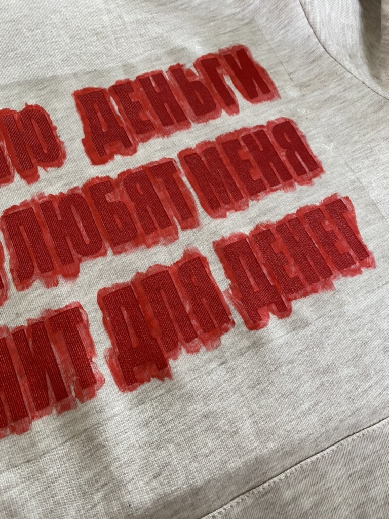 Я делала надпись на толстовке с помощью самодельного трафарета. Вот тут видно, что краска выглядит обычно.