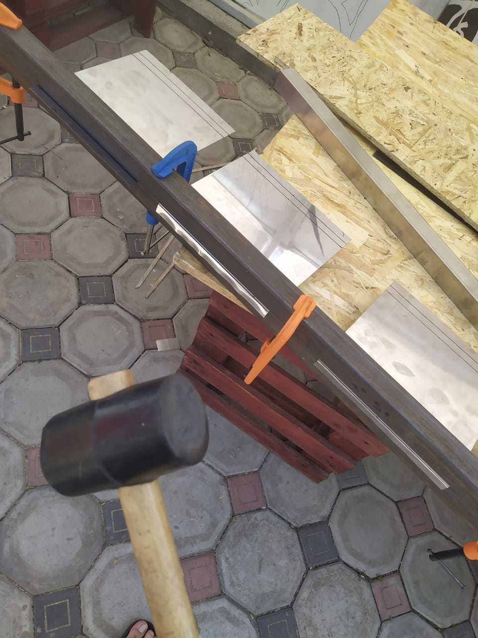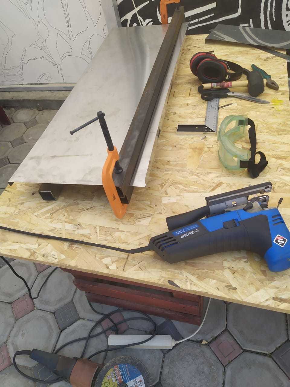 Металл отрезал по размеру и гнул с помощью струбцин и киянки. Получилось в два с половиной раза дешевле чем если бы я заказалкупил готовые столы. Я бы и рад просто купить, но блин, бюджет....
