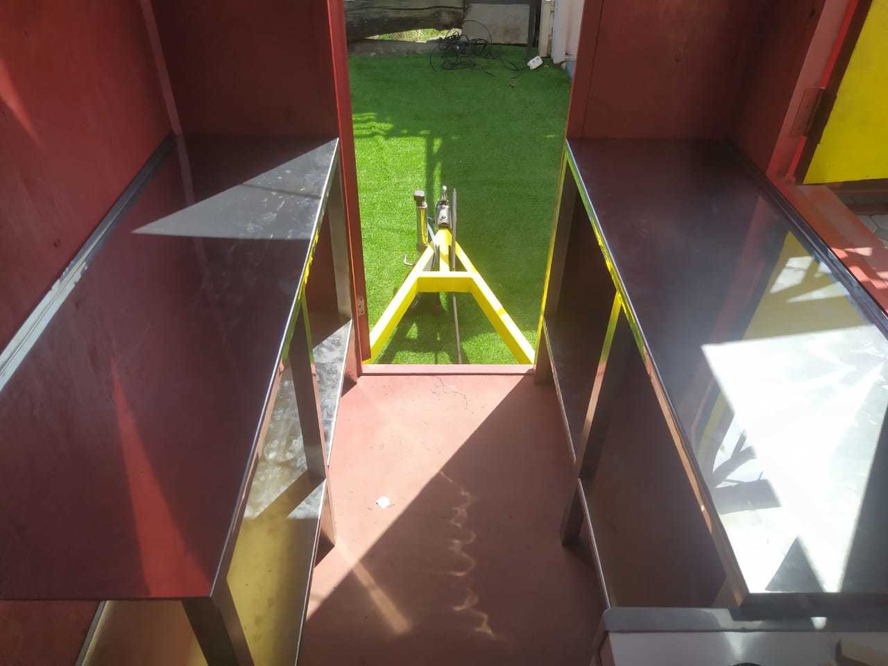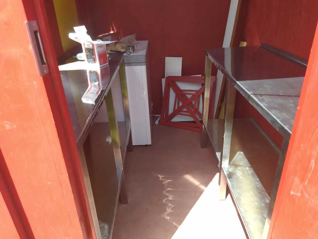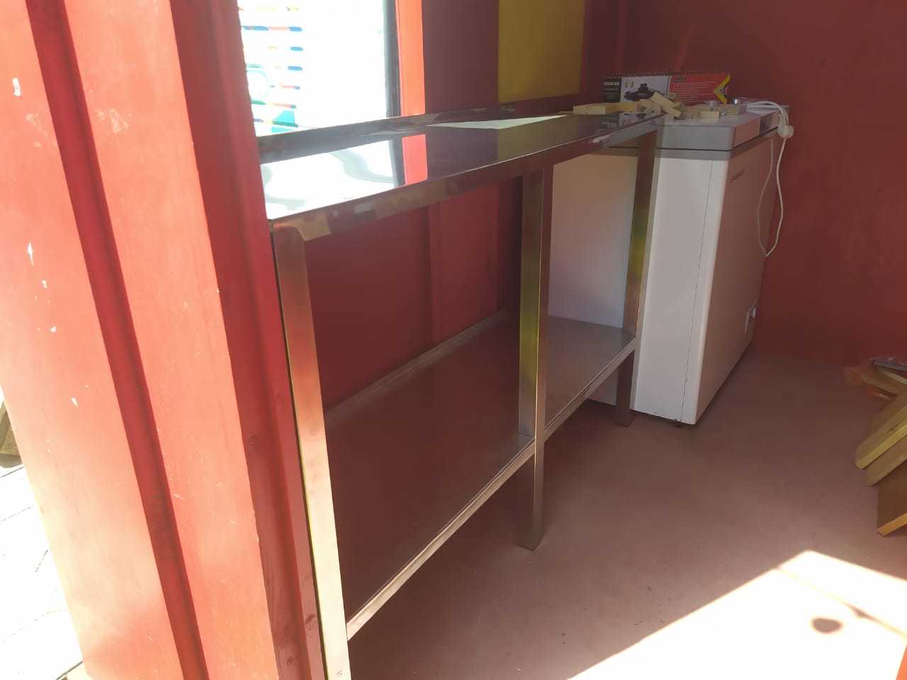 Прицеп (далее - фуд трак) внутри был абсолютно пустой, даже проводки не было, но где наша не пропадала. Купил один лист нержавейки (привес СЭС), одну квадратную трубу из той же нержавейки, длинной 6 метров, или чуть больше. Хватило ровно на две столешницы с нижними полками, одну полку сверху, и из кусочков сделал небольшие полочки для соусов и специй.