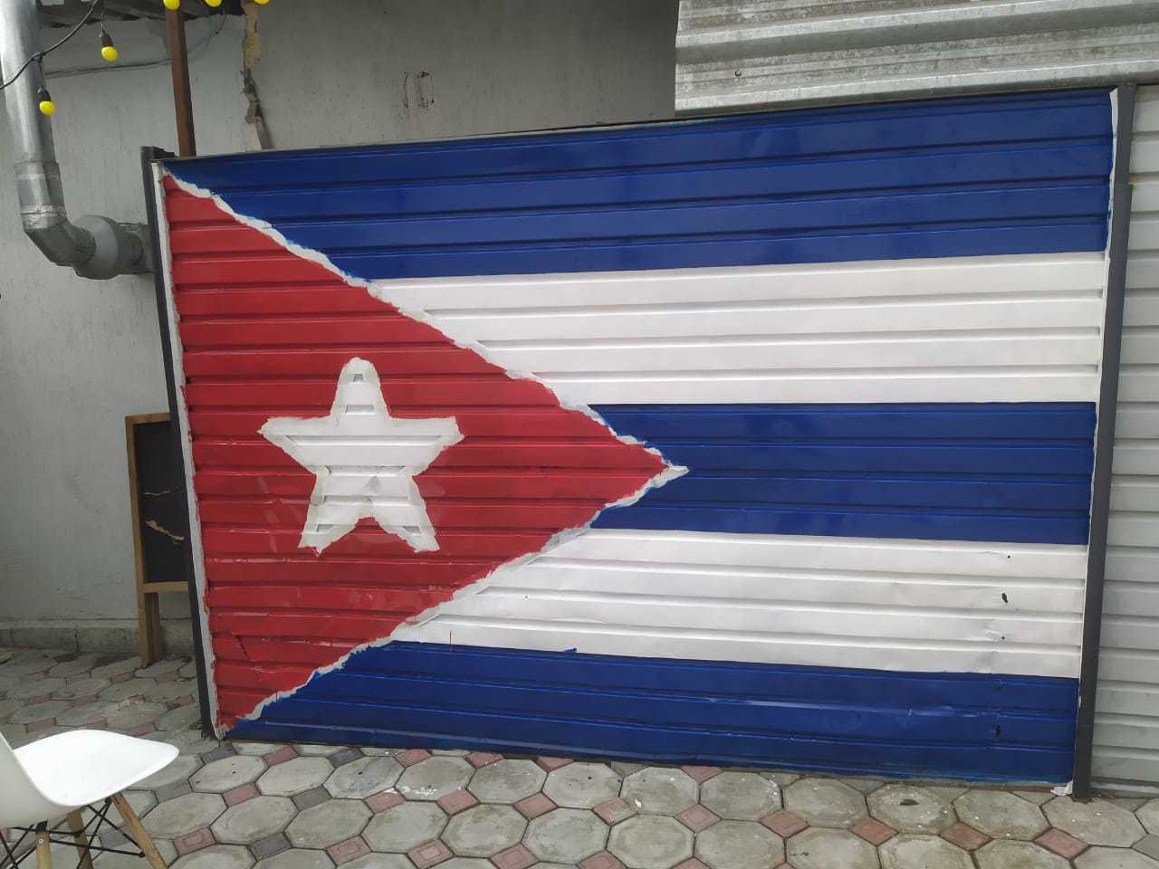 А и да, между делом, пока строился, ко мне редко, но заглядывали разные друзья, где-то в чем-то помогали, и во время разговора с одним из них он рассказал, что знаком с девушкой которая вышла замуж за кубинца, оба проживают тут в Алматы, и кубинец этот знает пару-тройку хороших рецептов кубинской кухни. После недолгого разговора с женой было принято решение делать в целом заведение в кубинском стиле. Таких в городе вроде не было, во всяком случае мы не припомнили, но это интересно и очень подходит летней площадке на уровне идеи. Решено, viva la Cuba! Поэтому пока шил чехлы решил покрасить одну часть забора изобразив на ней флаг Кубы.