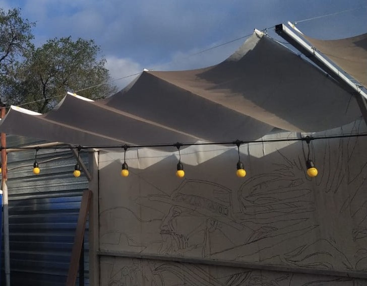 Далее съездил и купил пол-рулона винилового тента белого цвета и сшил из него навес. На тросы прикрепил к сваям, получилось более-менее не плохо.