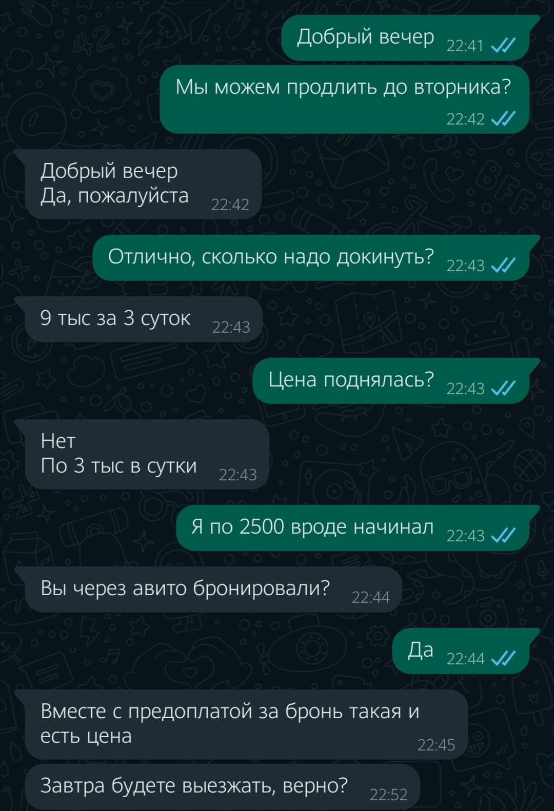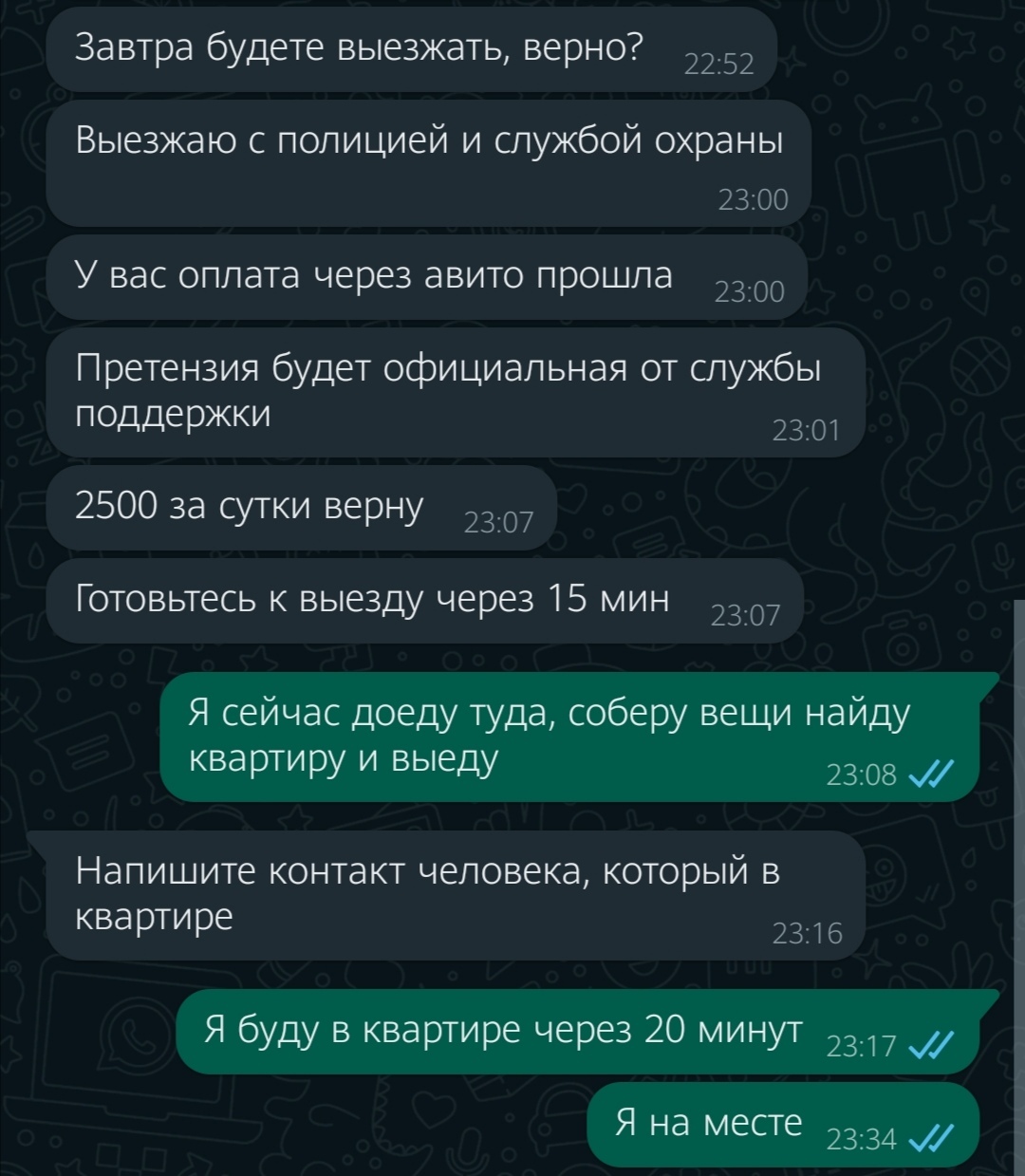 После этого я ей позвопил, чтобы разузнать о цене, по телефону она сказала тоже самое что написала в 22:45, я не понял этого тогда, и сейчас не могу понять, причем здесь предоплата за бронь, я ведь живу уже неделю в этой квартире, и все оплатил, как того требовали правила Авито.