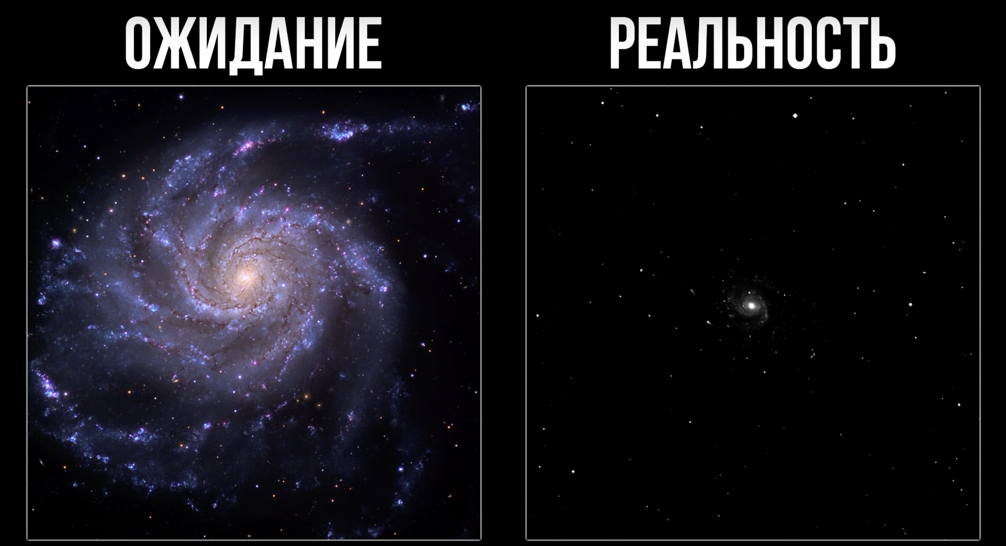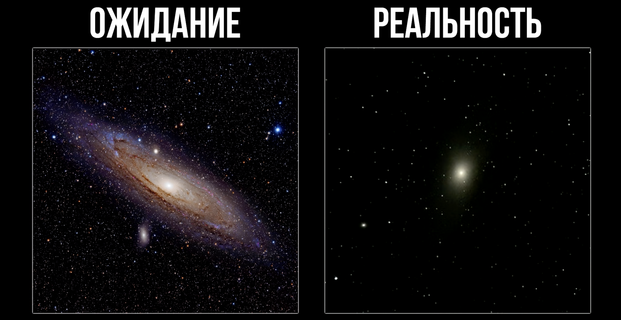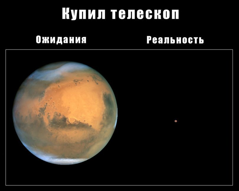 Но тут стоит отметить, что правая картинка в наш телескоп будет только при идеальных условиях наблюдения: далеко за городом, при ясном ночном небе, отсутствии турбулентности в атмосфере, новолунии и благоприятного времени наблюдения каждого конкретного объекта. А теперь представьте, что такое условия бывают 1-2-3 раза за лето и они не обязательно выпадают на выходные. Поедете в ночь среди недели за город, чтобы вернуться под утро и не поспав пойти на работу?