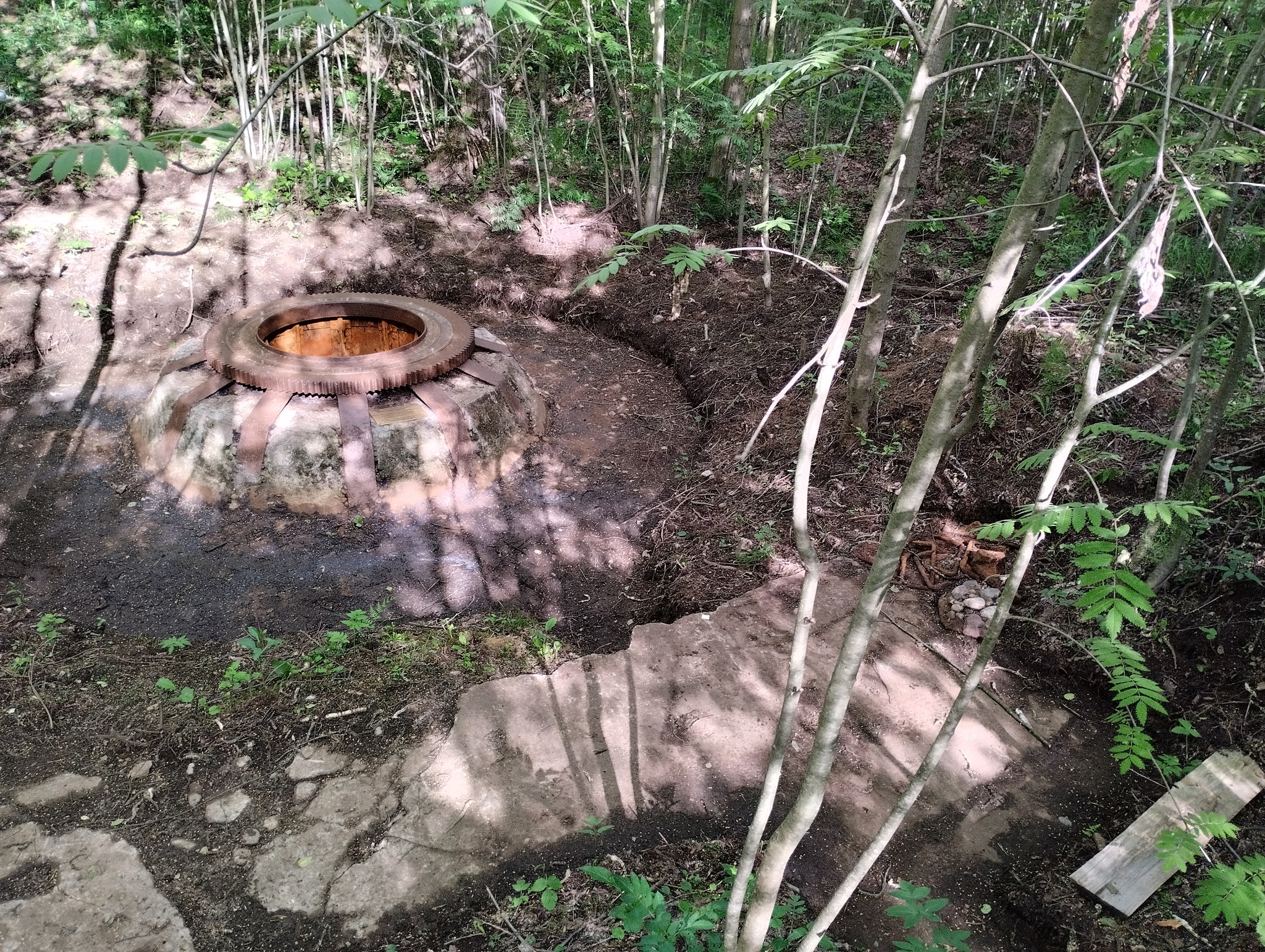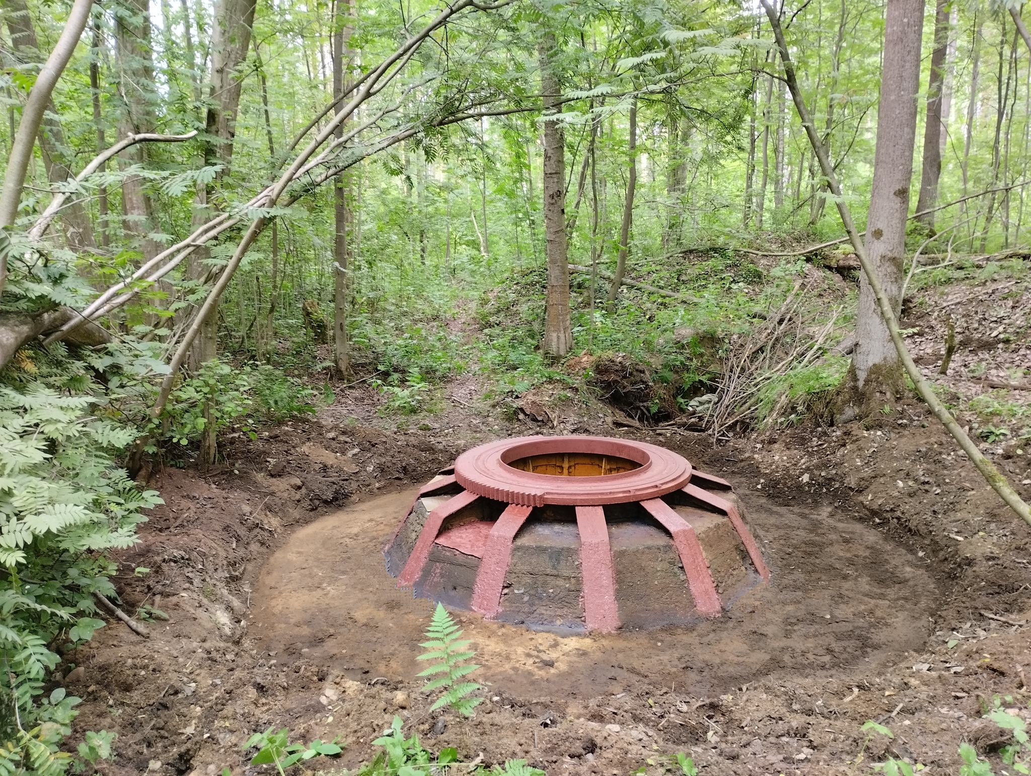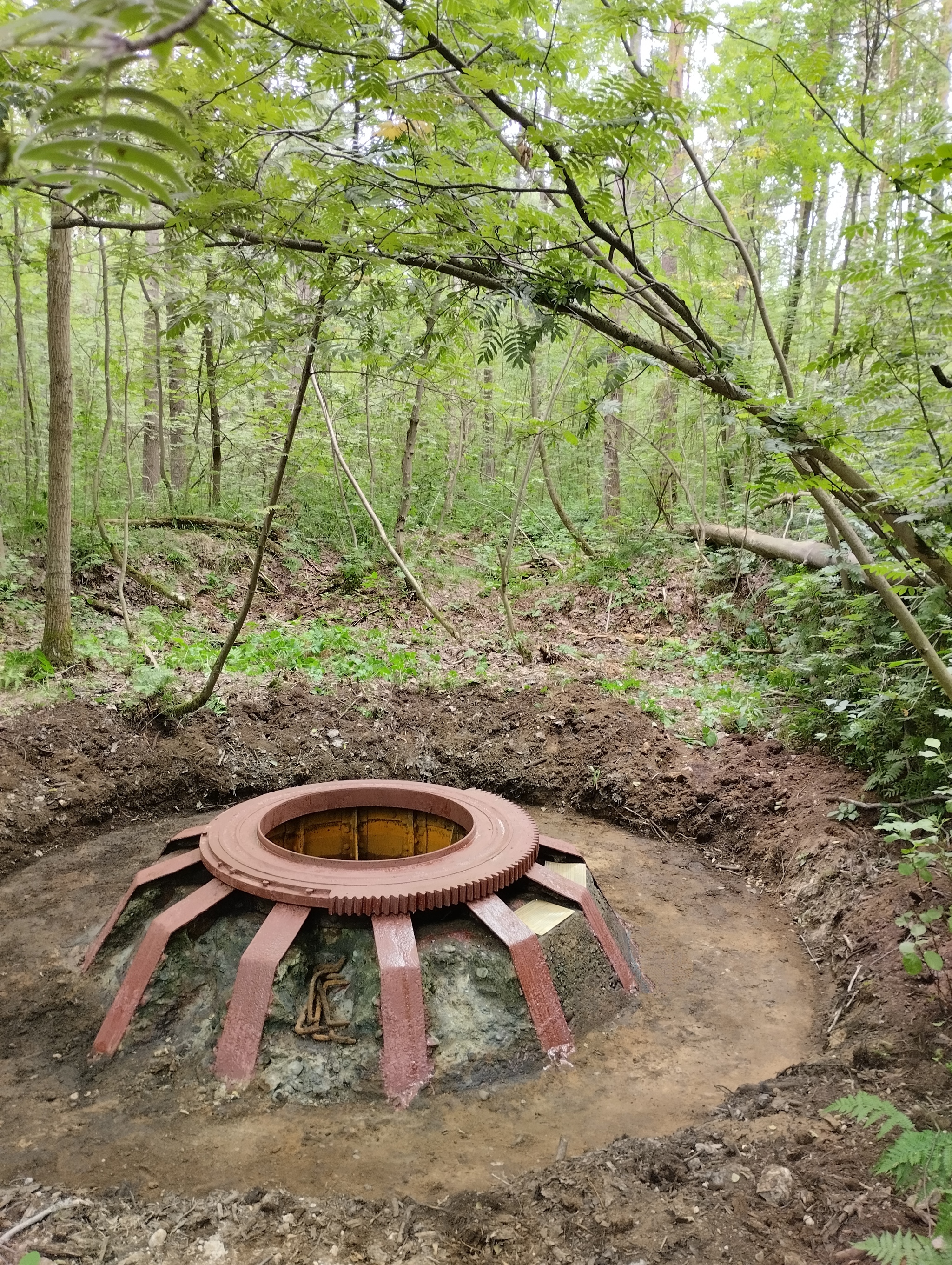 На дне дворика там не земля, а бетон. Всего под каждое орудие было залито ок. 100 кубометров бетона, + сделан парапет (частично он подчищен и виден на фото).