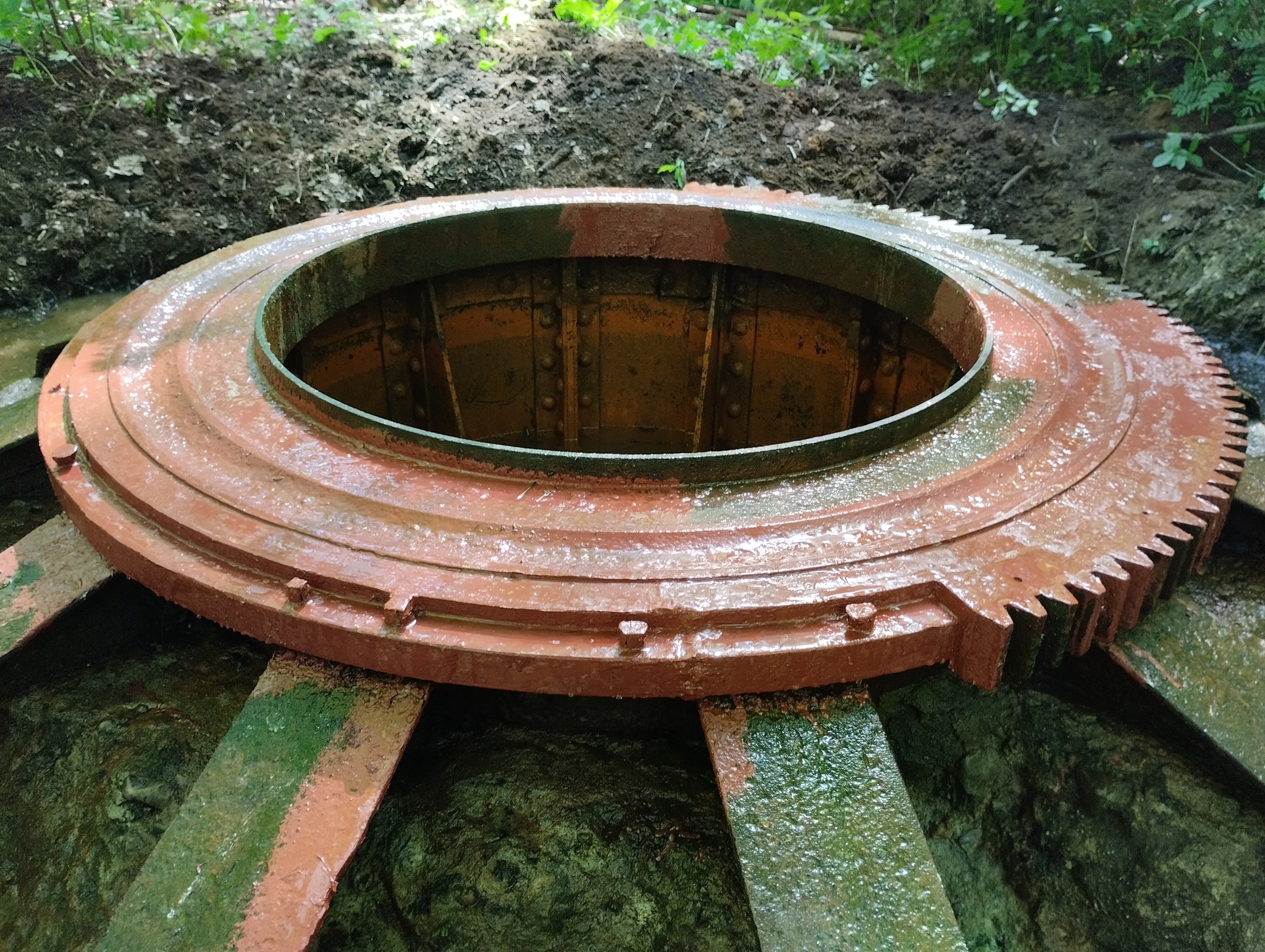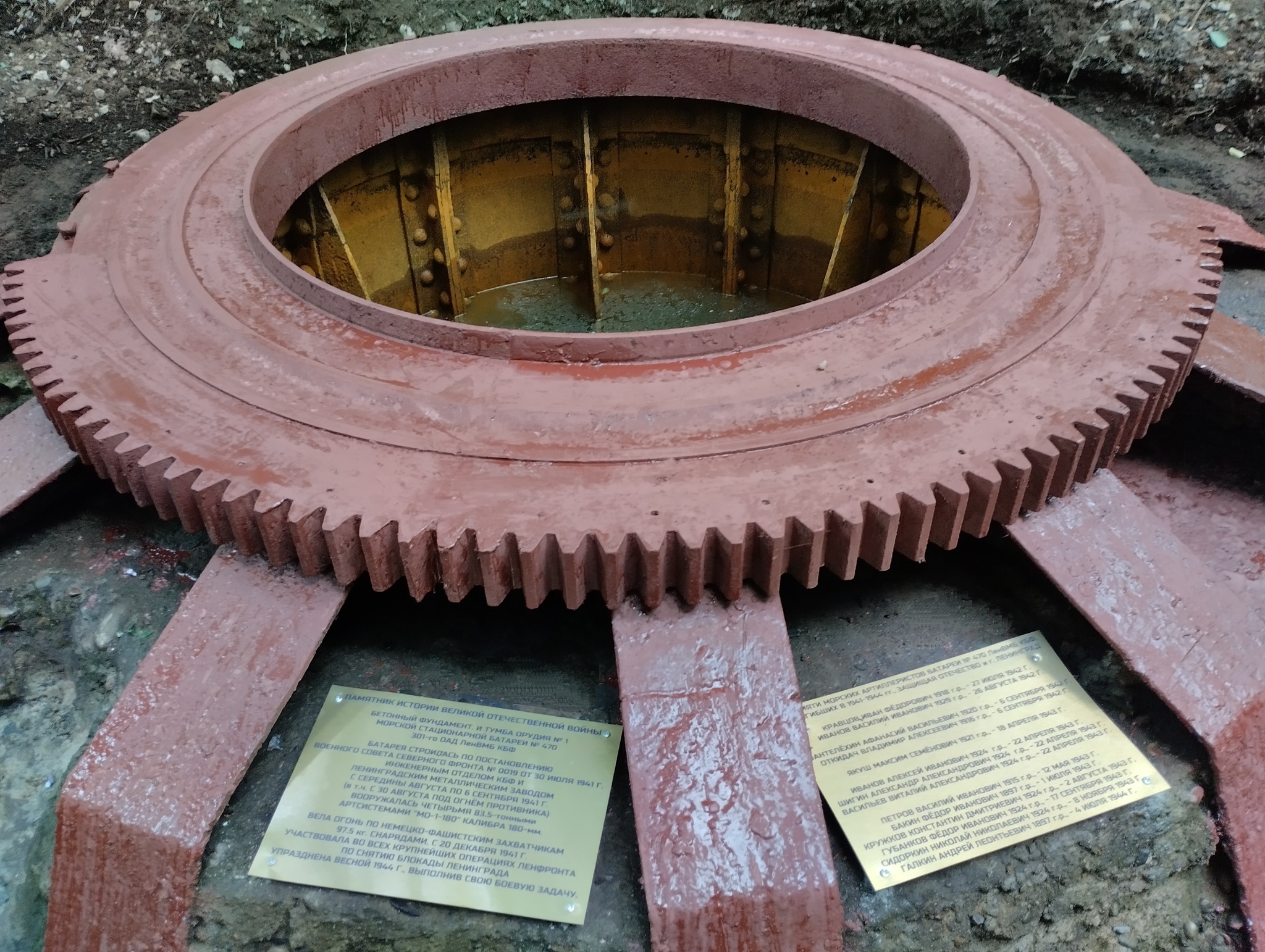 В эти колодцы опускался штыр артсистемы, а на зубчатый шаровый погон (круг) опиралась она сама, через открытый шариковый подшипник. С зубьями входил в зацепление механизм горизонтальной наводки орудия, управляемый вручную либо электродвигателем.