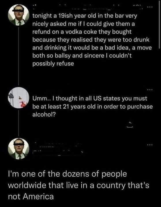 — Я думал что в штатах не продают алкоголь до 21 года.
