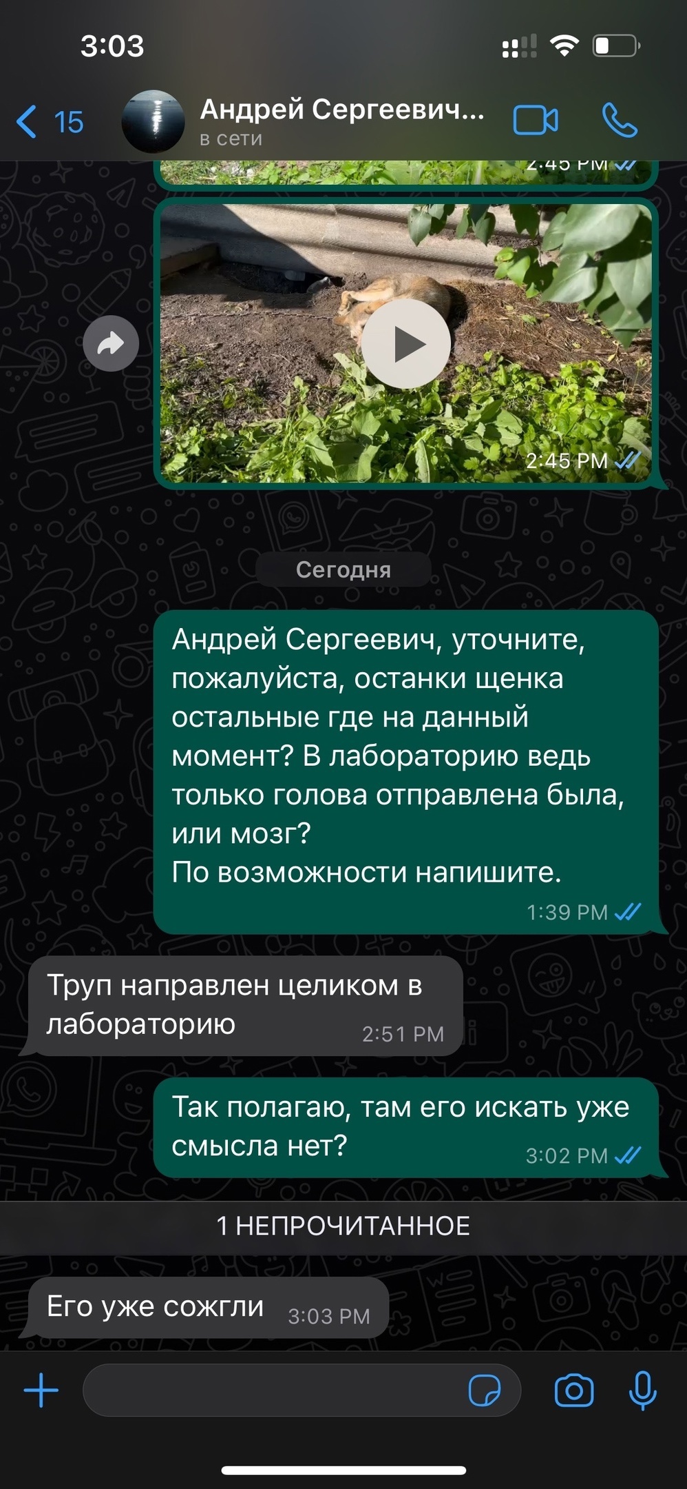 14:15 Доверенным лицом труп щенка передан водителю СББЖ для перевозки в лабораторию;