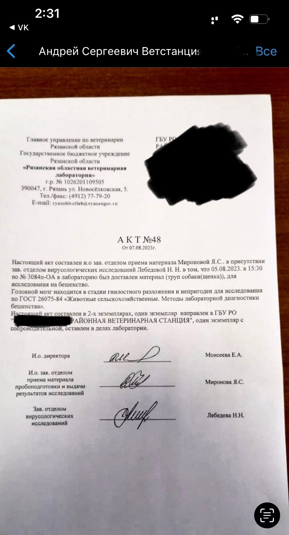 14:30 От Рязанской областной ветеринарной лаборатории получен акт N48 от 07.08.23, составленный ИО зав. отделом приёма материала Мироновой Я.С. в присутствии зав. отделом вирусологических исследований Лебедевой Н.Н., согласно которому «Головной мозг находится в стадии гнилостного разложения и непригоден для исследования по ГОСТ 26075-84 «Животные сельскохозяйственные. Методы лабораторной диагностики бешенства»