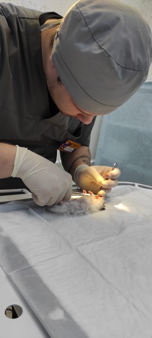 Подготовка операционной, пациента. Катетер, наркоз, оперполе, доступ. Крови, кстати, было немного, возможно особенность (не знаю, птицу оперировала 2 раз в жизни). Кости сопоставили, спицу засверлили. Ушивание раны, швы, повязка.