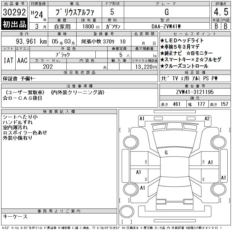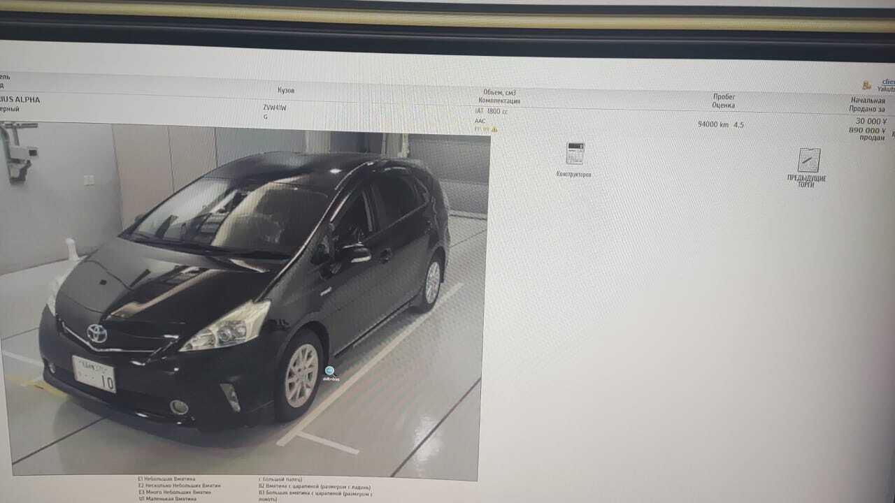 Уже вечером раздался звонок и менеджер мне радостно сообщает, что первый же лот мы выиграли и это Toyota Prius Alpha 2012 года в комплектации G с пробегом 93 тыс километров и аукционной оценкой 4.5 балла. Выиграл я его за 890 тыс йен.