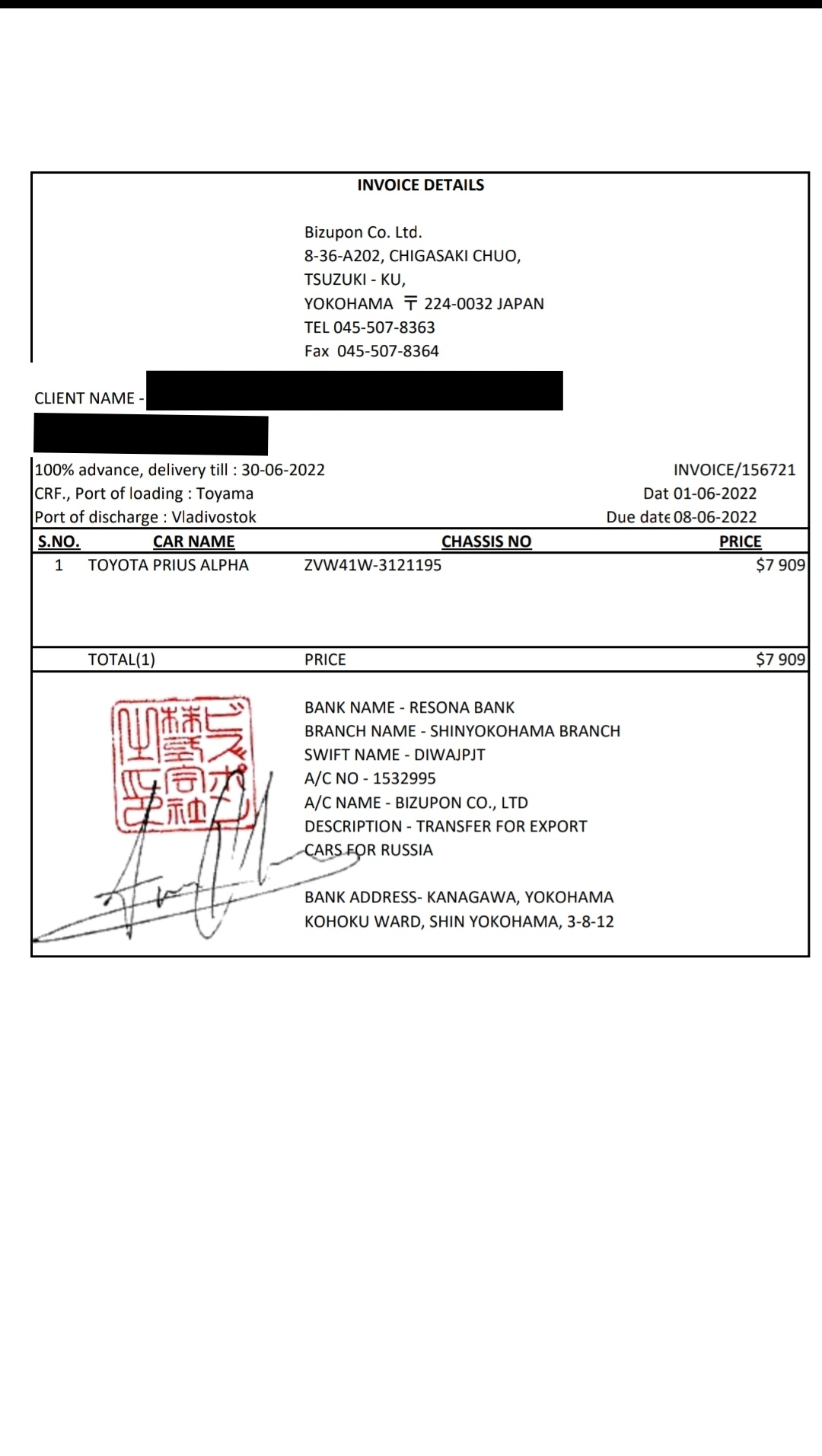 Далее мне японцы отправили инвойс на оплату автомобиля и на затраты по транспортировке автомобиля по Японии до порта. Мне повезло что аукцион проходил поблизости от порта и мне насчитали совсем немного. Вот как выглядит инвойс на оплату.