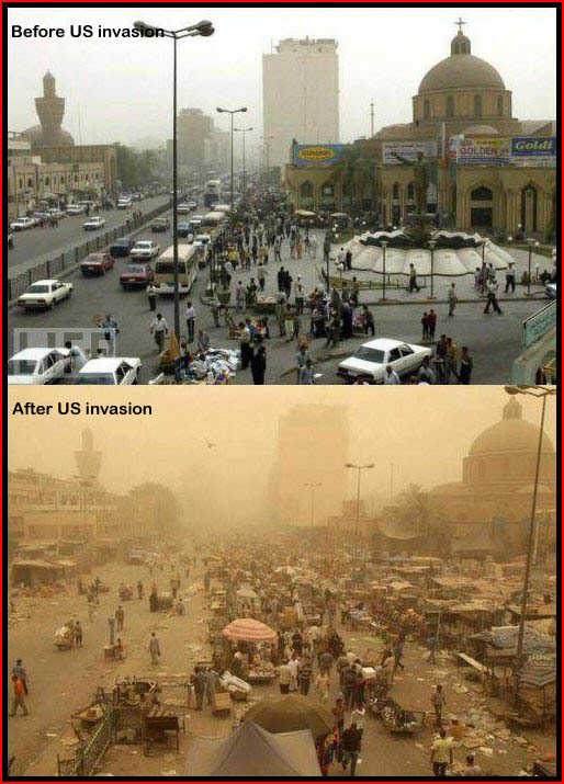Что касается разделения жителей страны и разделение режима... то в том же Ираке по оценке даже того же ВОЗ только от насильственной смерти умерло 150 тыс. человек. В других странах - тоже счёт на десятки и на сотни тысяч только прямых смертей. Ещё в разы, в десятки раз больше калек, людей, пострадавших от голода, болезней, стресса, условий жизни. Полностью разрушенные и до сих пор не восстановленные экономики.