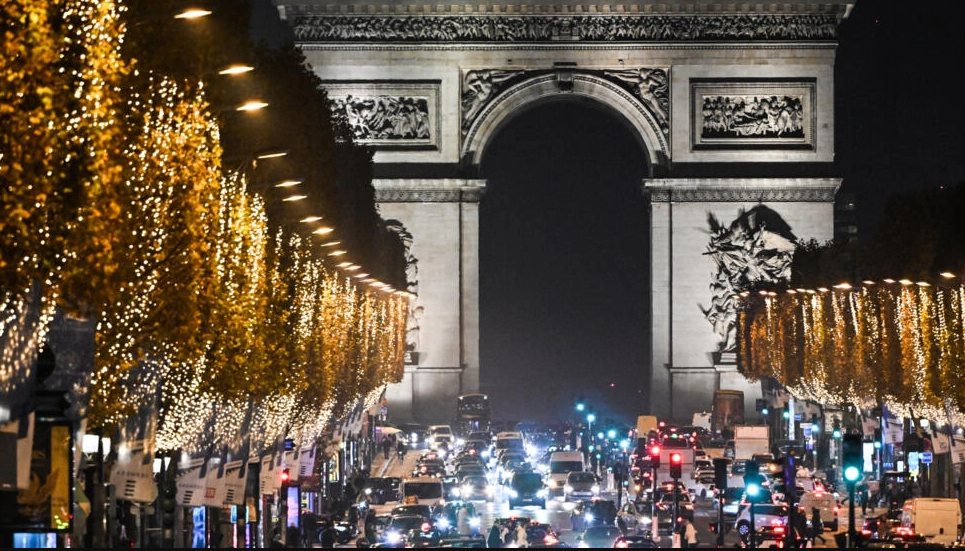 В Париже водители в пробке любуются красотой вечерней подсветки.