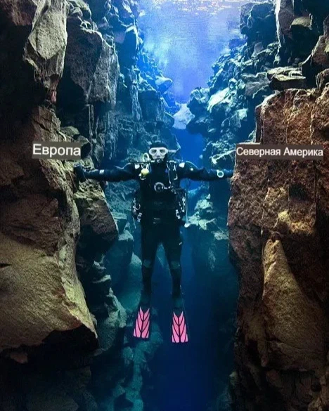 На фото уникальнейшее место на нашей планете. Это не просто какая-то трещина в подводной скале, а место стыка Евразийской и Северо-Американской тектонических плит. То есть дайвер на фотографии одновременно касается руками двух континентов.