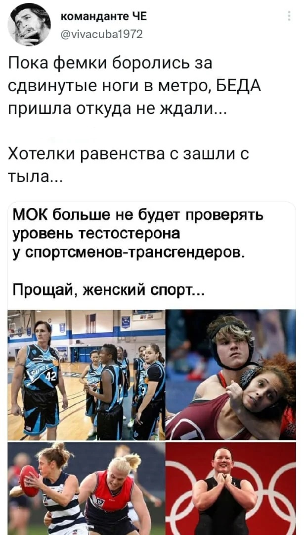 Я уже давно считал, что в эпоху феминизма и тотального равенства всех трёх полов крайне несправедливо делить соревнования по наличию или отсутствию пизды у участников соревнования.