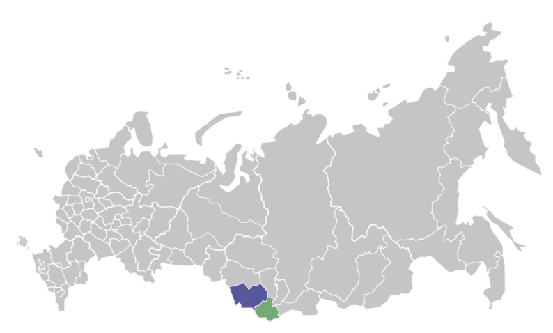 Алтайский край (синий) и республика Алтай (зелёный) на карте России: