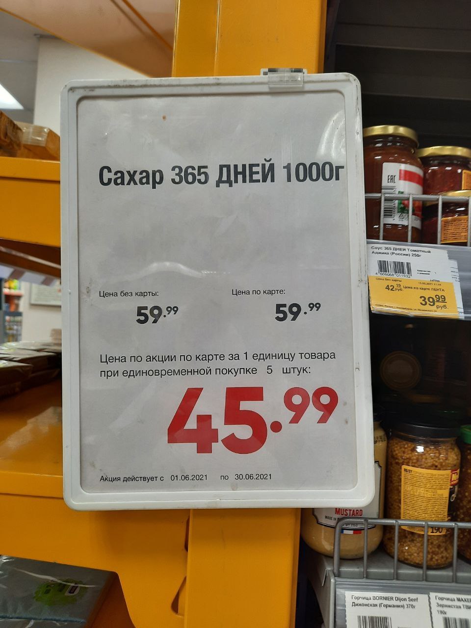 Я:- А как же акция? При покупке 5 пакетов сахара цена за единицу 45,99.