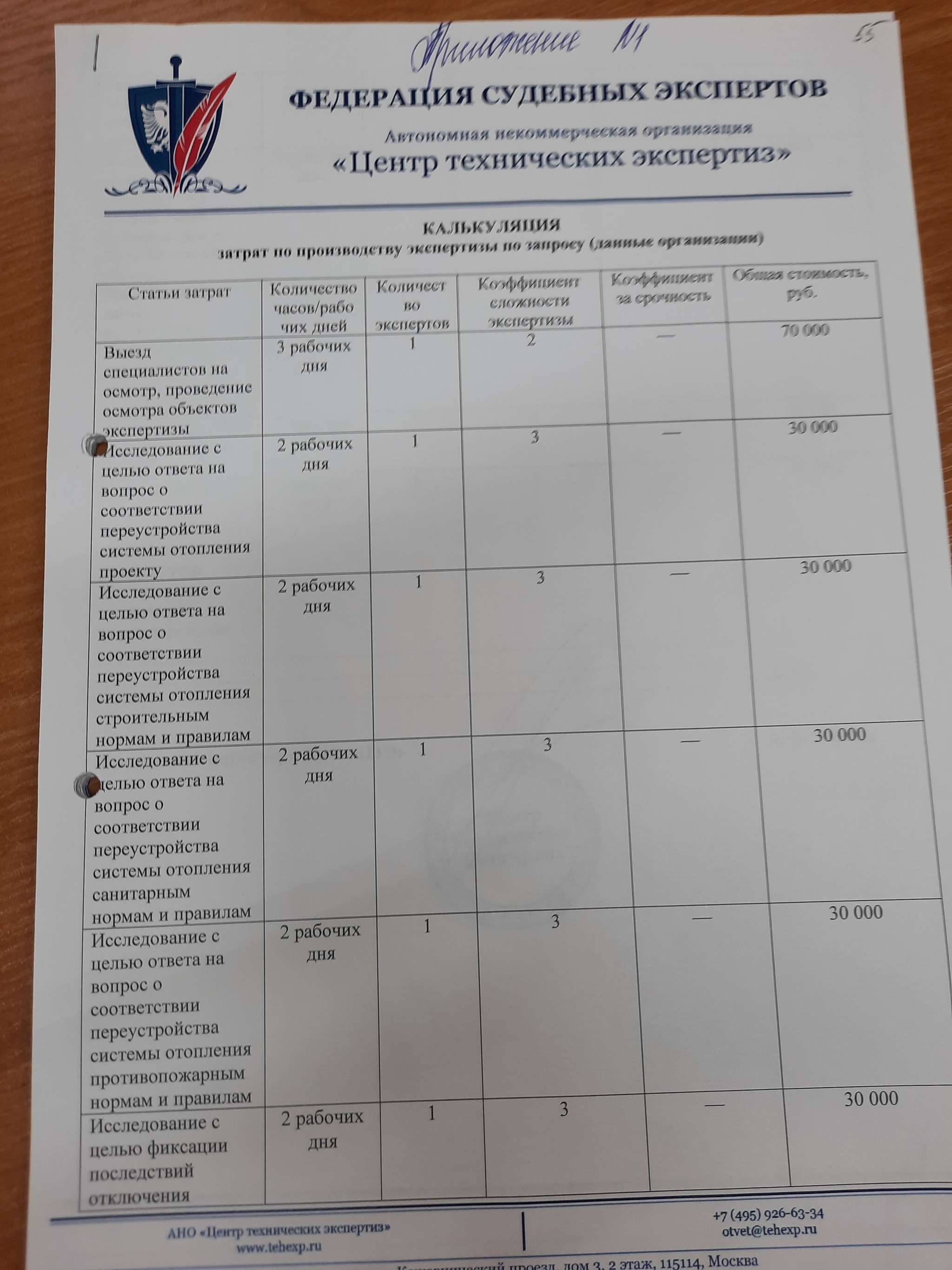 Идем дальше. 60 тысяч рублей в лаборатории запросили за то, что якобы они проводили исследование «с целью ответа на вопрос о соответствии переустройства системы отопления санитарным и противопожарным нормам и правилам». Оно, как понимаем, точно также не проводилось, и это подтверждено специалистами лаборатории в суде.