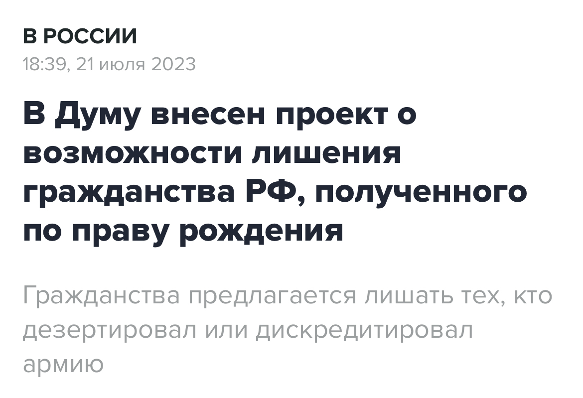 Депутат госдумы Михаил Матвеев подготовил законопроект, согласно которому непостановка на воинский учёт в установленный законом срок после приобретения российского гражданства (а также уклонение от воинской обязанности) будут становиться основанием для лишения российского гражданства и выдворением в страну, откуда такой "гражданин" прибыл .