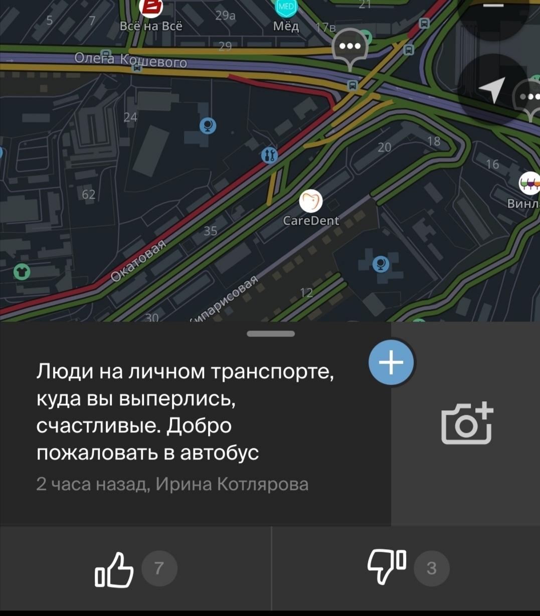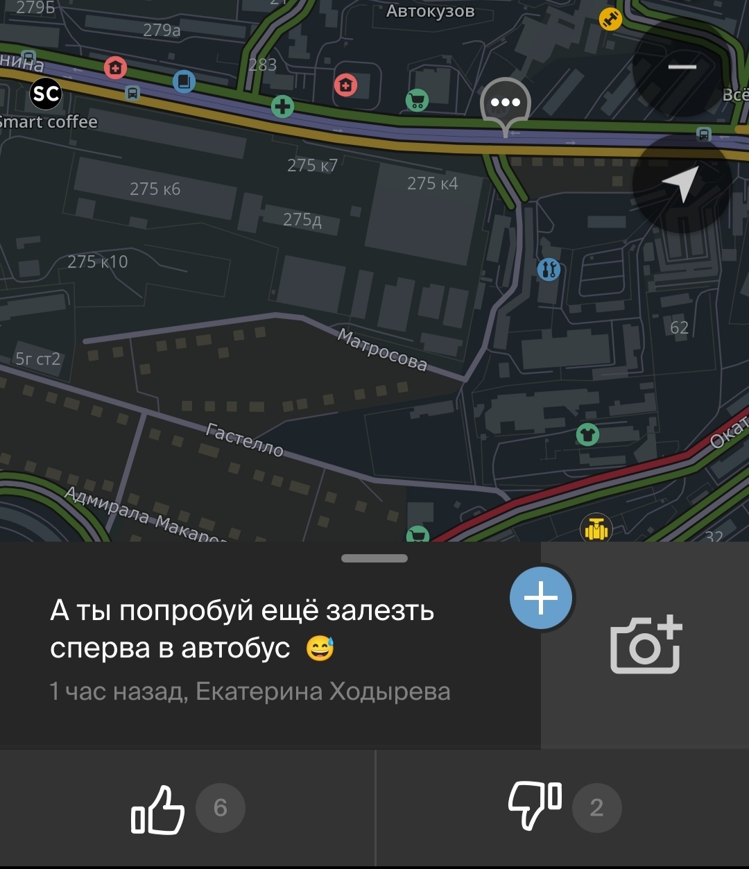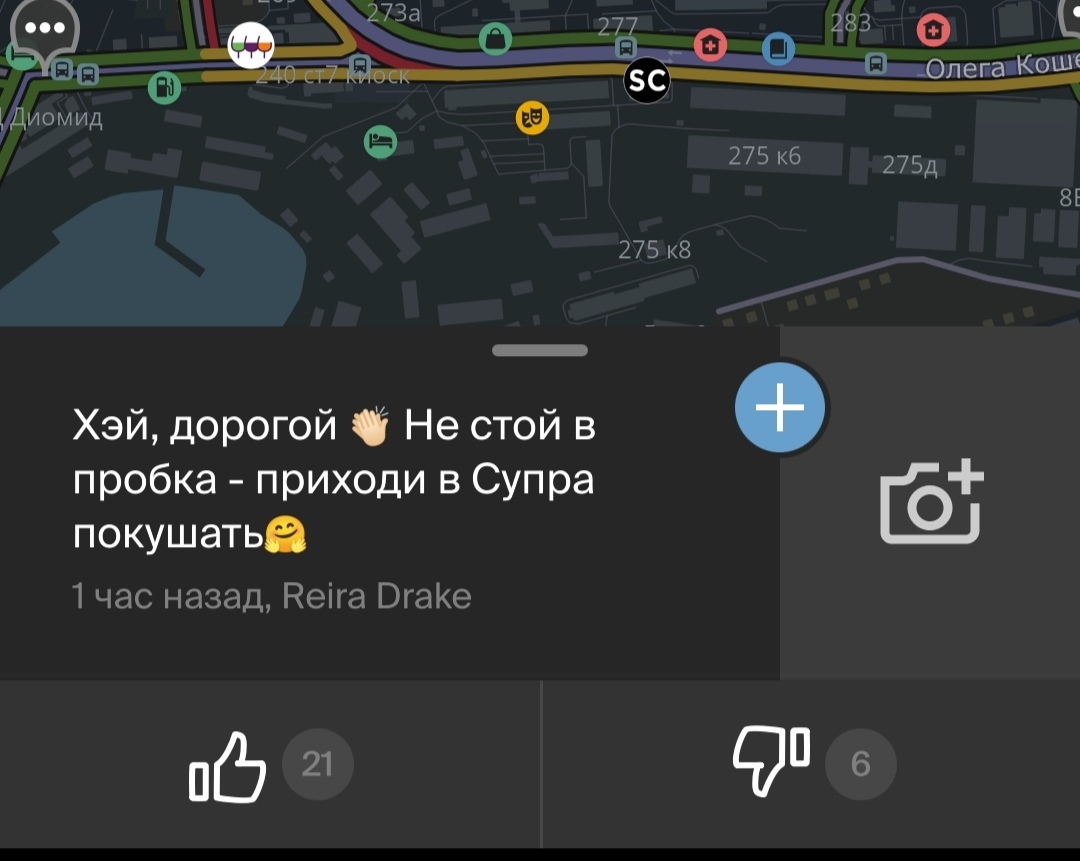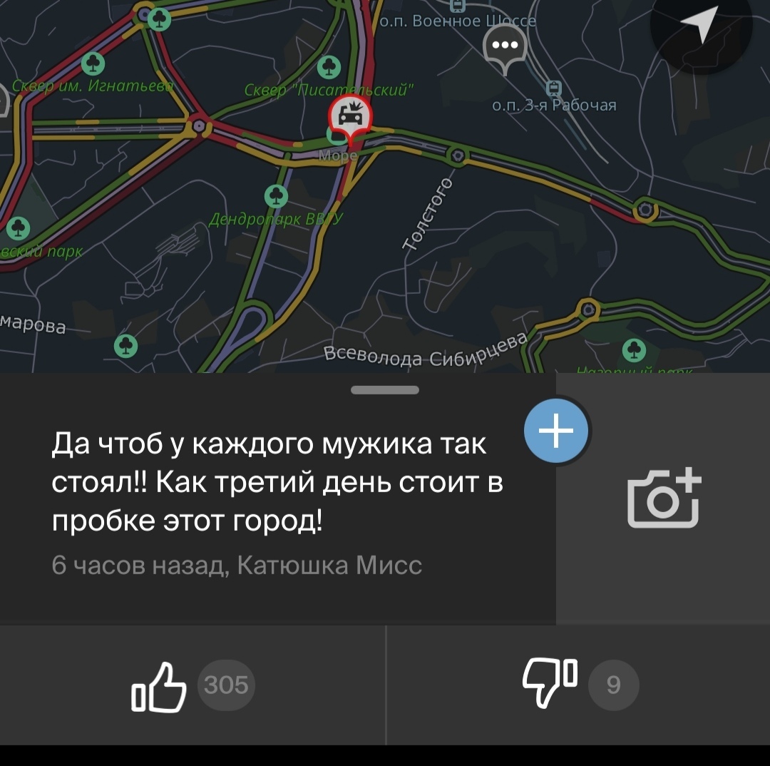 Пробки 10 баллов во всех скользких направлениях. Поэтому, коротая вечерок в доооолгом путешествии с работы домой, строю маршрут в 2гис, чтобы узнать, собственно, где кончается чертова пробка и сколько времени мне в ней стоять, наслаждаюсь комментариями страдальцев-автолюбителей: