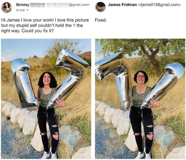 Джеймс Фридман - британский графический дизайнер, известный тем, что принимает запросы в Твиттере на изменение фотографий, но отвечает изображениями, отредактированными с немного другими характеристиками для создания комедийного эффекта.
