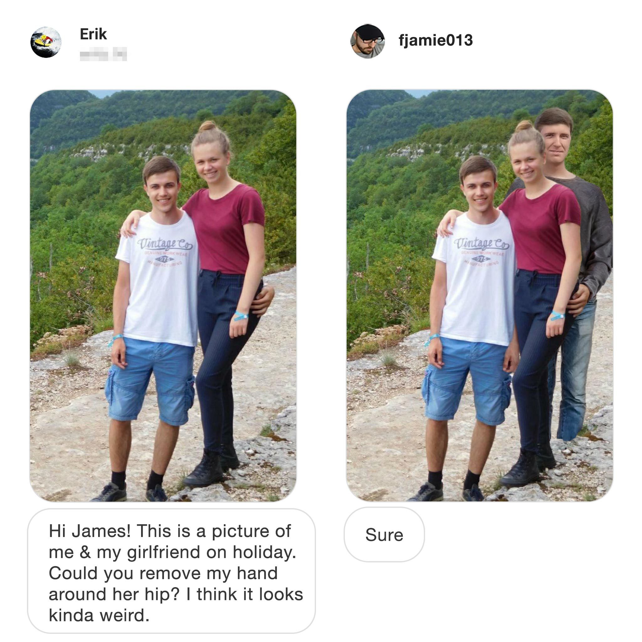 Привет Джеймс! Это фото меня и моей девушки на отдыхе. Ты не мог бы удалить мою руку вокруг ее бедра? Я считаю что это смотрится как-то странно.