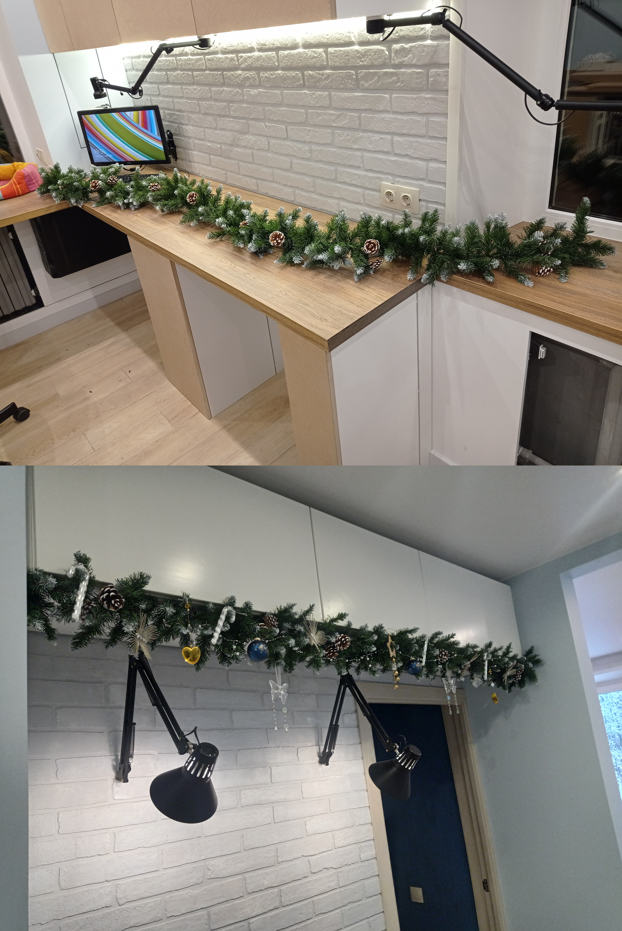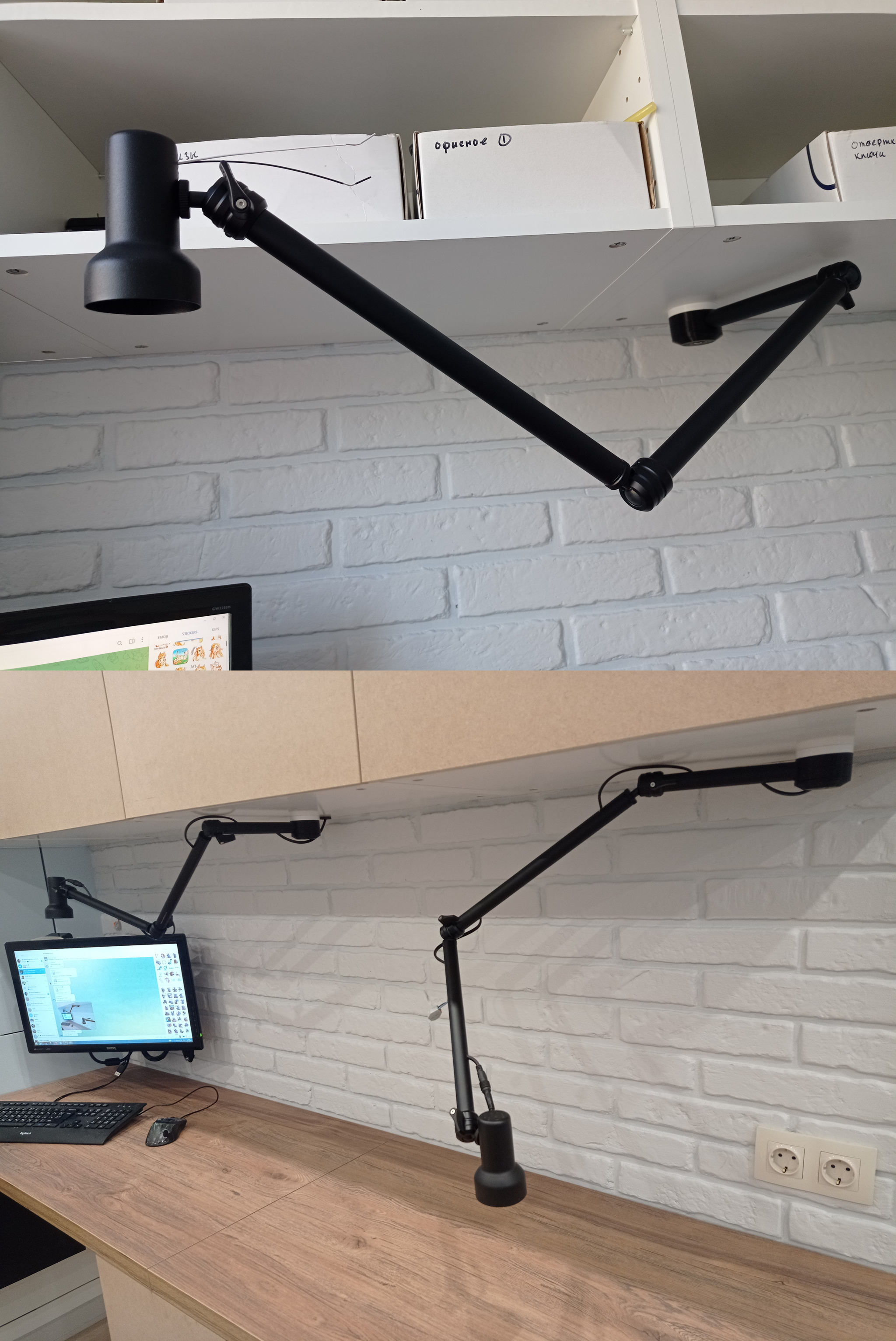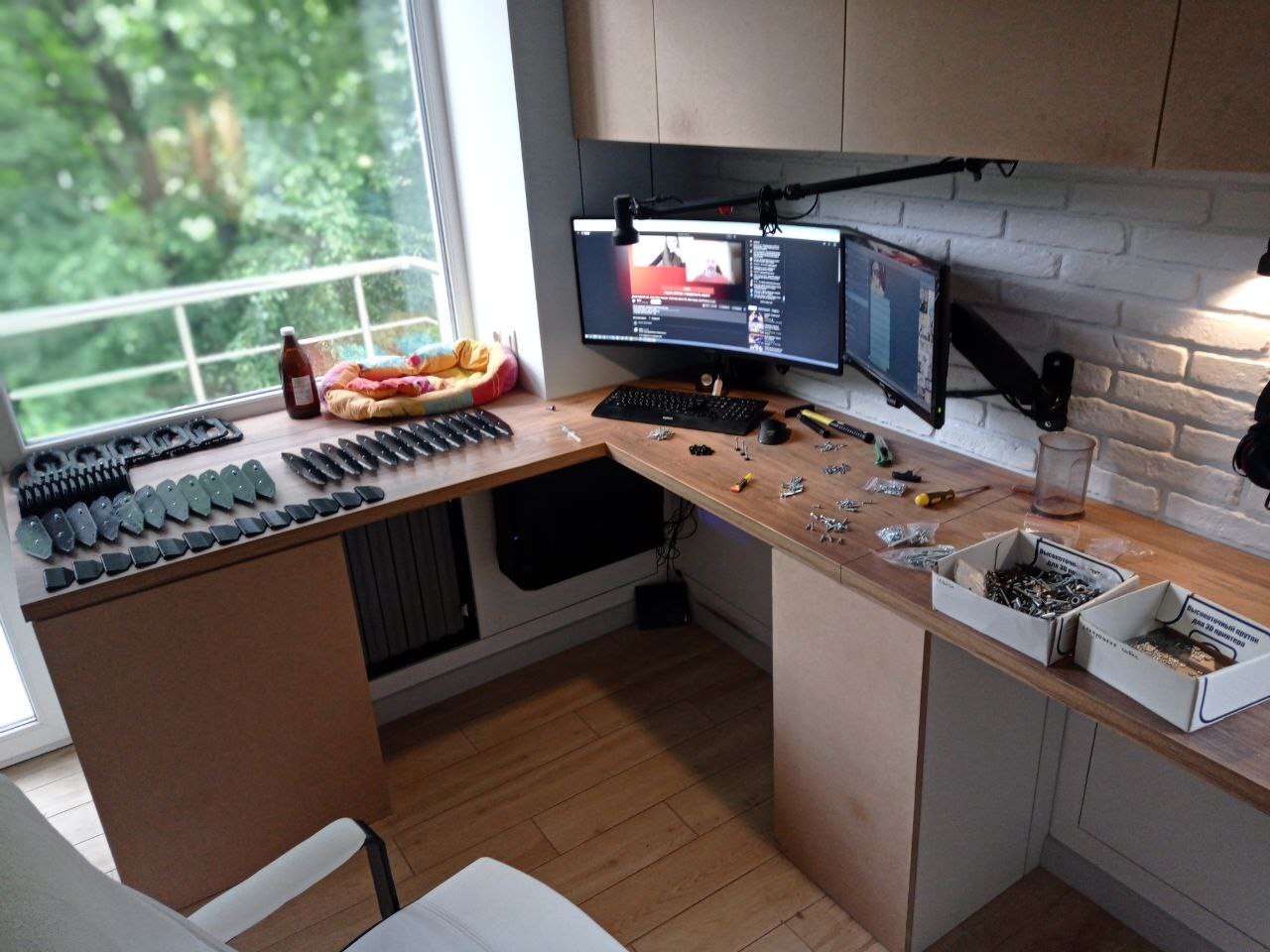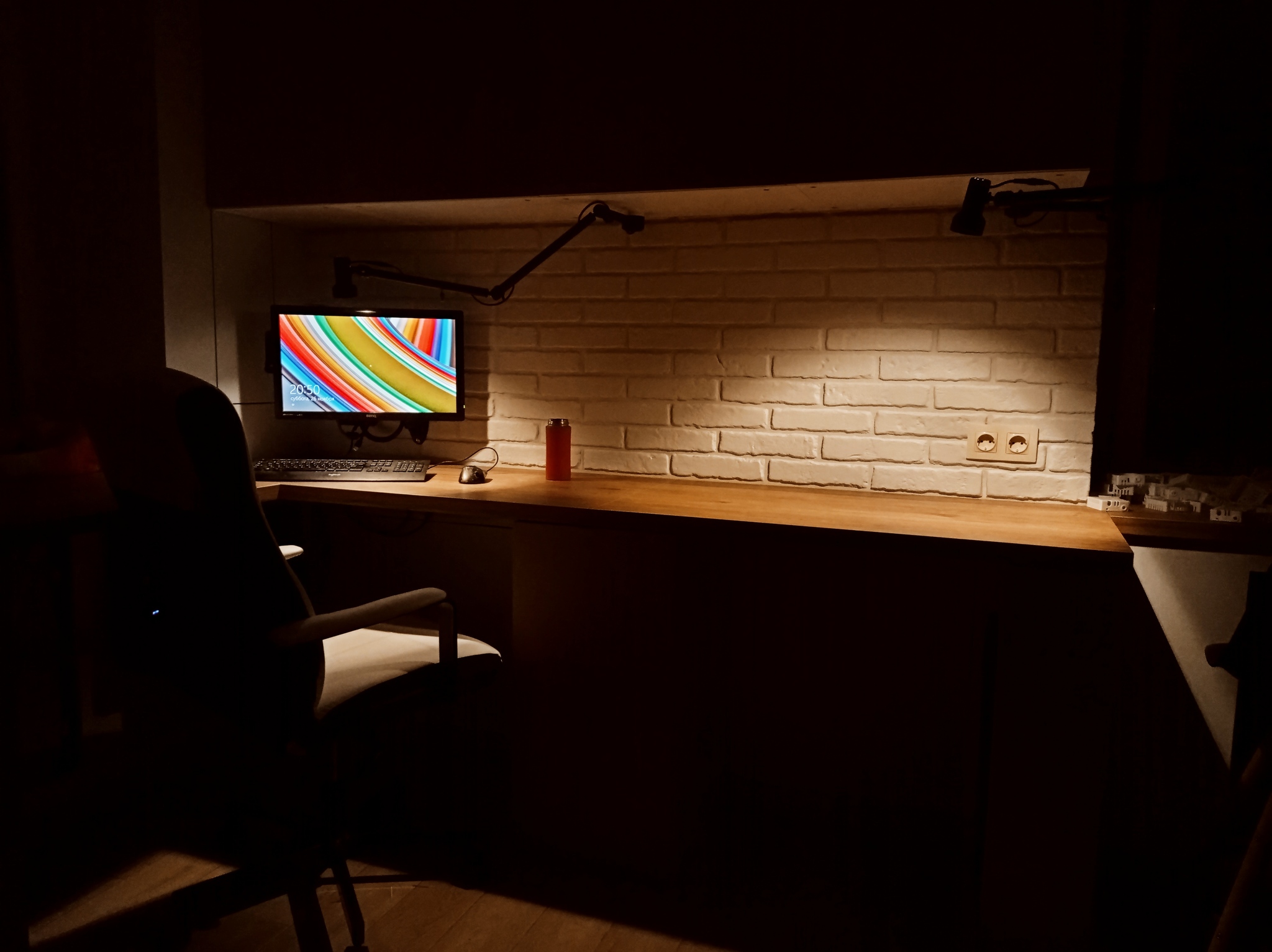 В общем и целом - рабочее место реализовалось примерно на 90% от изначальных идей и задумок. Есть ли что то, что неудобно, или не додумано? Да, отчасти есть - как я сказал, добавление еще одного освещения - это импровизация, а не изначальный проект. Также, я немного промахнулся с размерами столов - расстояние между тумб , хоть и достаточно для стула, маловато - +10, +20см и было бы идеально. Это не критичная недоработка, да и размеры комнаты ограничены - но все же, факт есть факт, этот недостаток проявляется в том, что при выезде из за стола ножки стула периодически стукаются о тумбу.