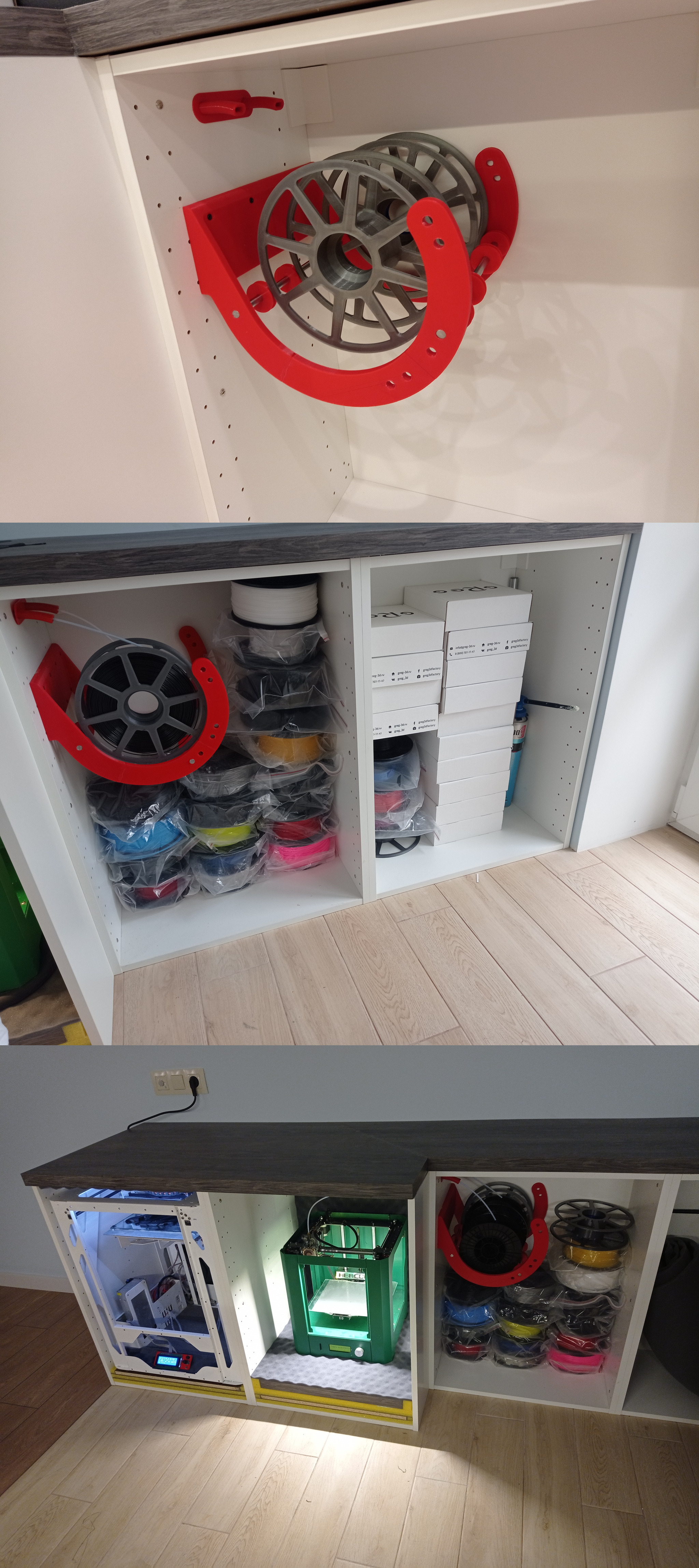 Еще одна задача - хранение и подача прутка. Для подачи пластика в принтера я сделал универсальный крепеж для бобин любого типа. Серебристые бобины - разборные, в них можно установить мотки прутка без бобин. В правых секциях хранится собственно пруток. Чтобы подача шла плавно, впоследствии заменил ролики скольжения на шарикоподшипники