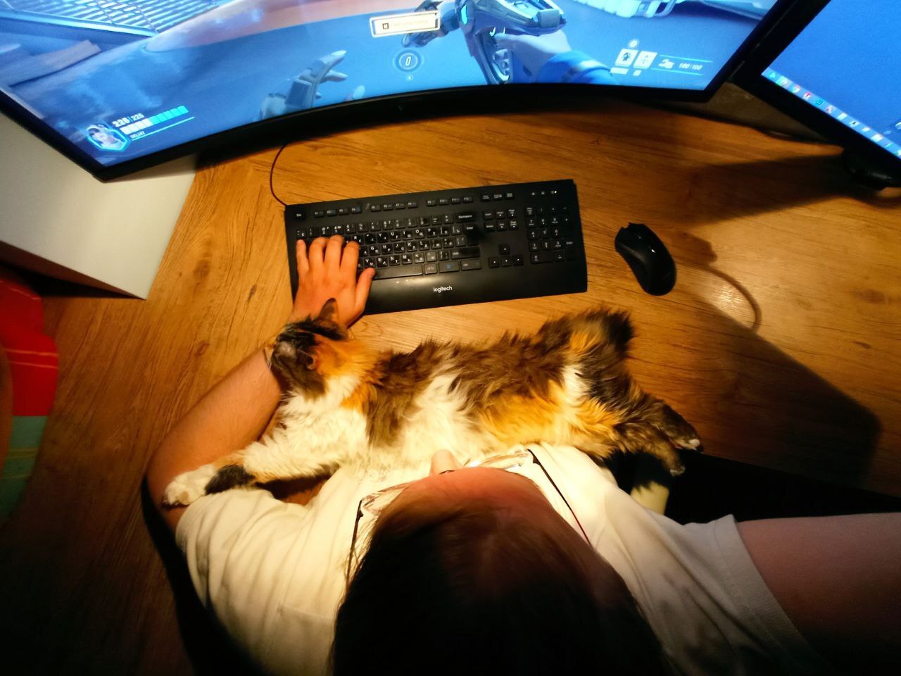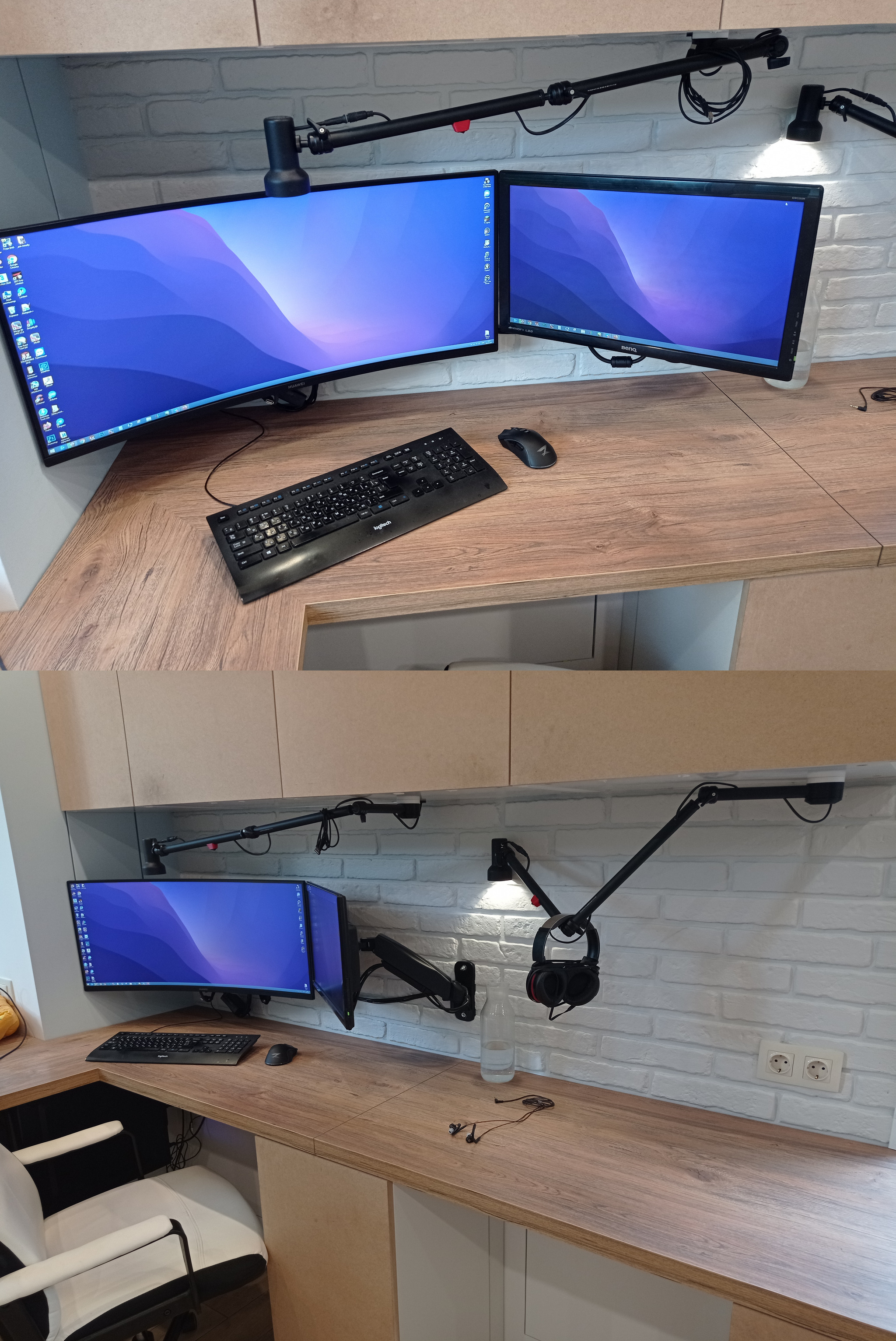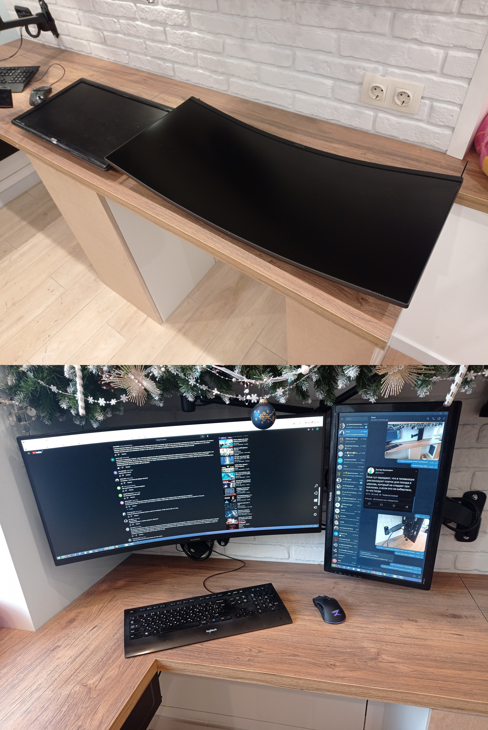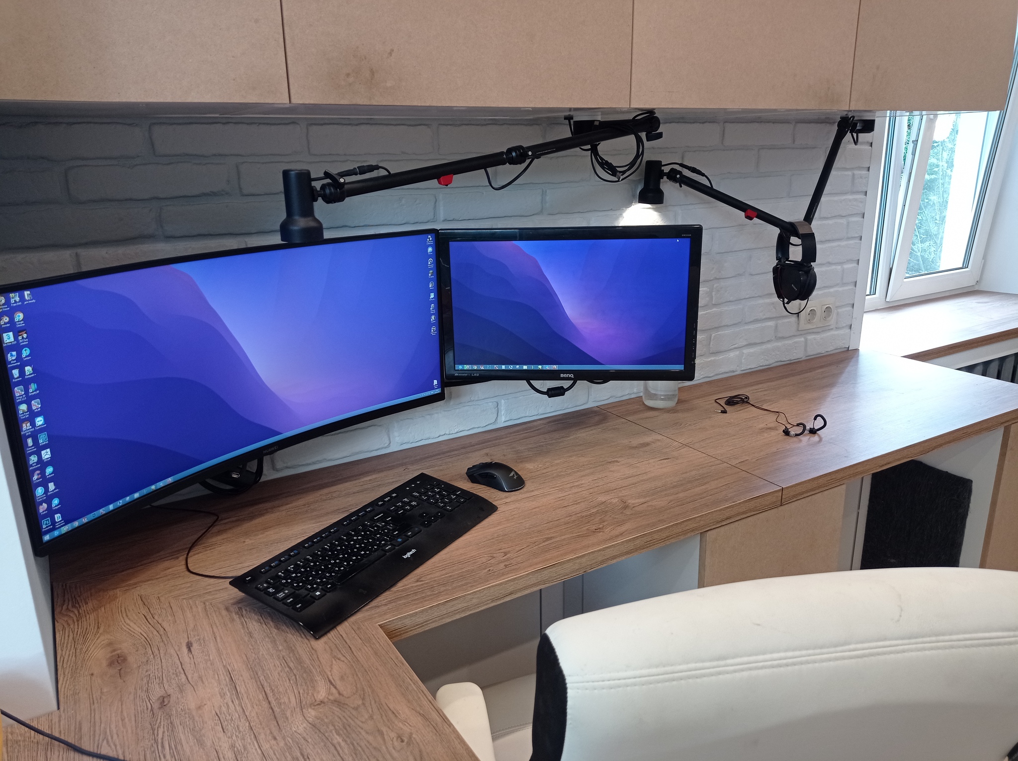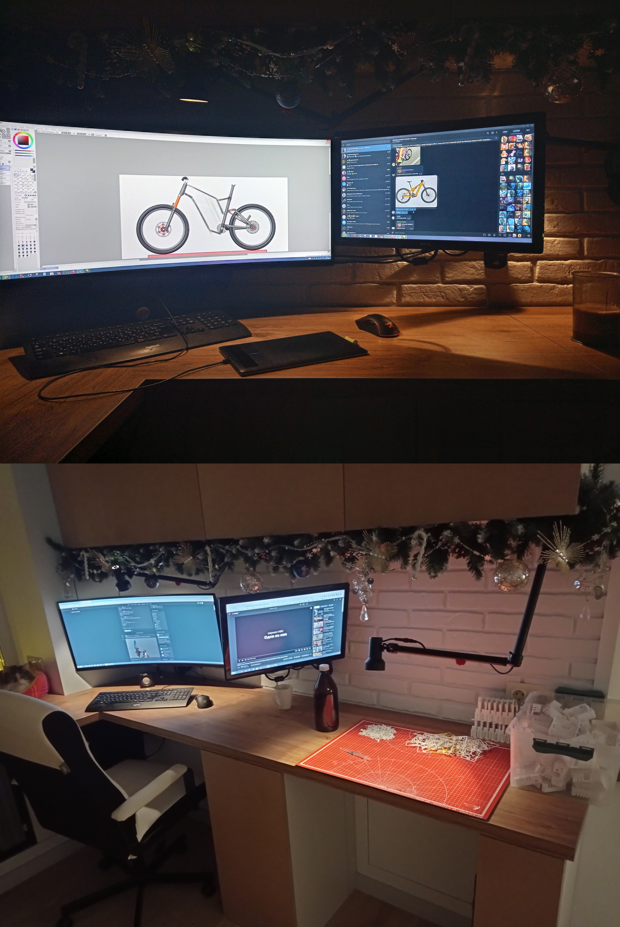 Первое время, я был прям в жутком восторге - новый экран просто поражал воображение своими размерами. Под него был куплен кронштейн, и я решил сохранить и старый монитор - в конце концов, вывести на него референс или рабочий чат - удобно. Вообще, 2 монитора идеально вписались в рабочее место - при работе за вторым рабочим столом, малый монитор можно удобно расположить, выведя на него фоновый фильм, или чертеж, или какой то референс.