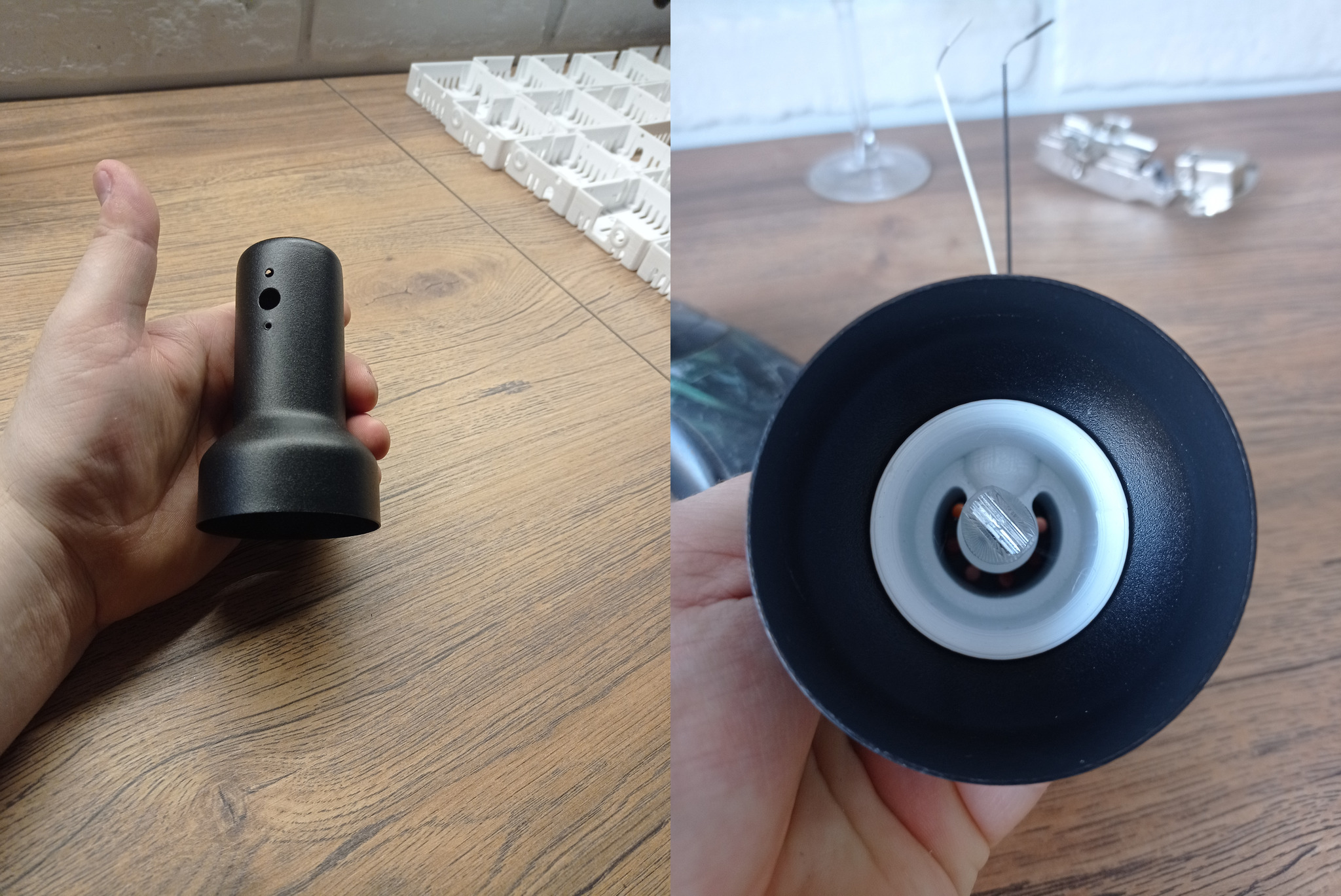 У штативов (точнее, штанг) отпилил основания, вместо них отпечатал еще один шарнир, вращающийся на 360 градусов и имеющий крепление к потолку шкафчиков. В трубках просверлил отверстия, и протащил внутри проводку. Вывел проводку за шкафы, где есть трансформаторы 12в, и запитал свои новые лампы.