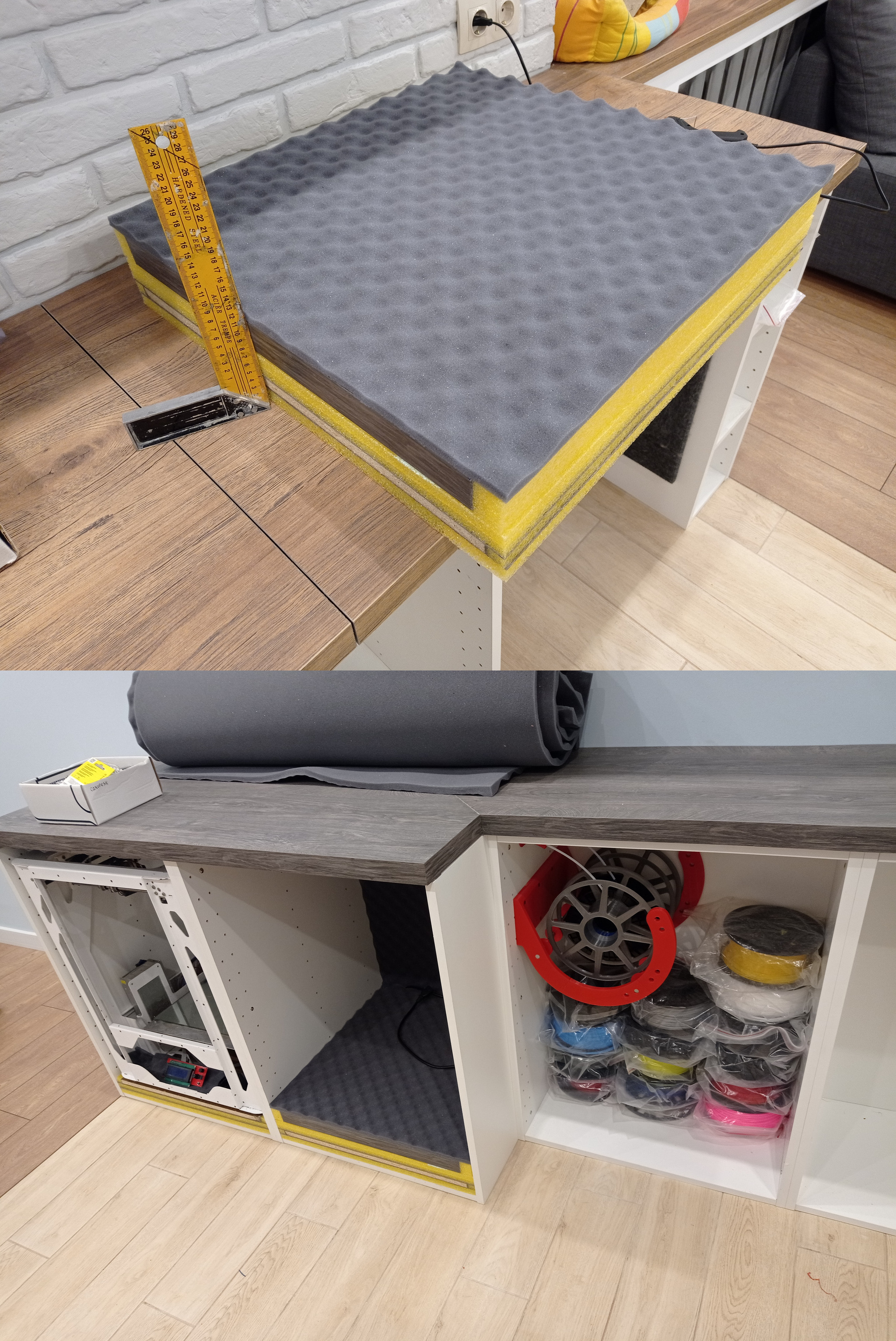 На фото не зафиксировал, но финальным штрихом всей конструкции была еще плита МДФ, стоящая на надутой велосипедной камере - это позволило полностью убрать передачу вибрации. Как я сказал, эти меры позволили на 100% заглушить все звуки от принтеров (при закрытых дверях, я часто не могу с расстояния метра сказать, работают они или нет)