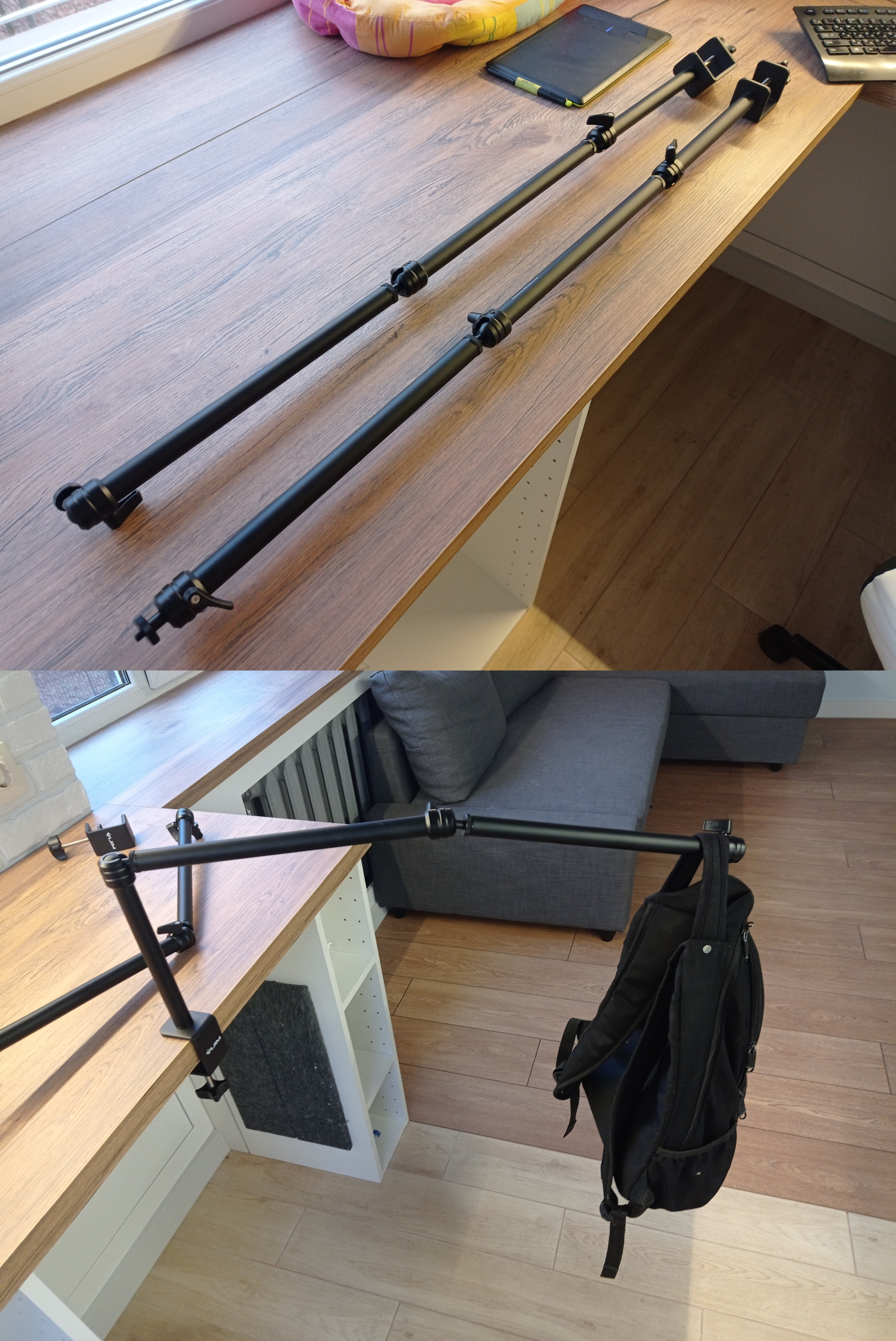 Получилось вполне себе недурно. Лампы нарочно крепятся легкосьемно - их можно открутить , отключив универсальный разъем. Имея на нем 12в, можно запитать что то, с чем балуешься в конкретный момент, также, по моей задумке, эти штанги можно применять как *третью руку* установив в них зажимы - как я сказал, они довольно прочные и могут выдержать достаточно большой вес. Вообще, за год эксплуатации могу сказать, что это очень удобные универсальные лапы, которые полностью удовлетворяют моим хотелкам