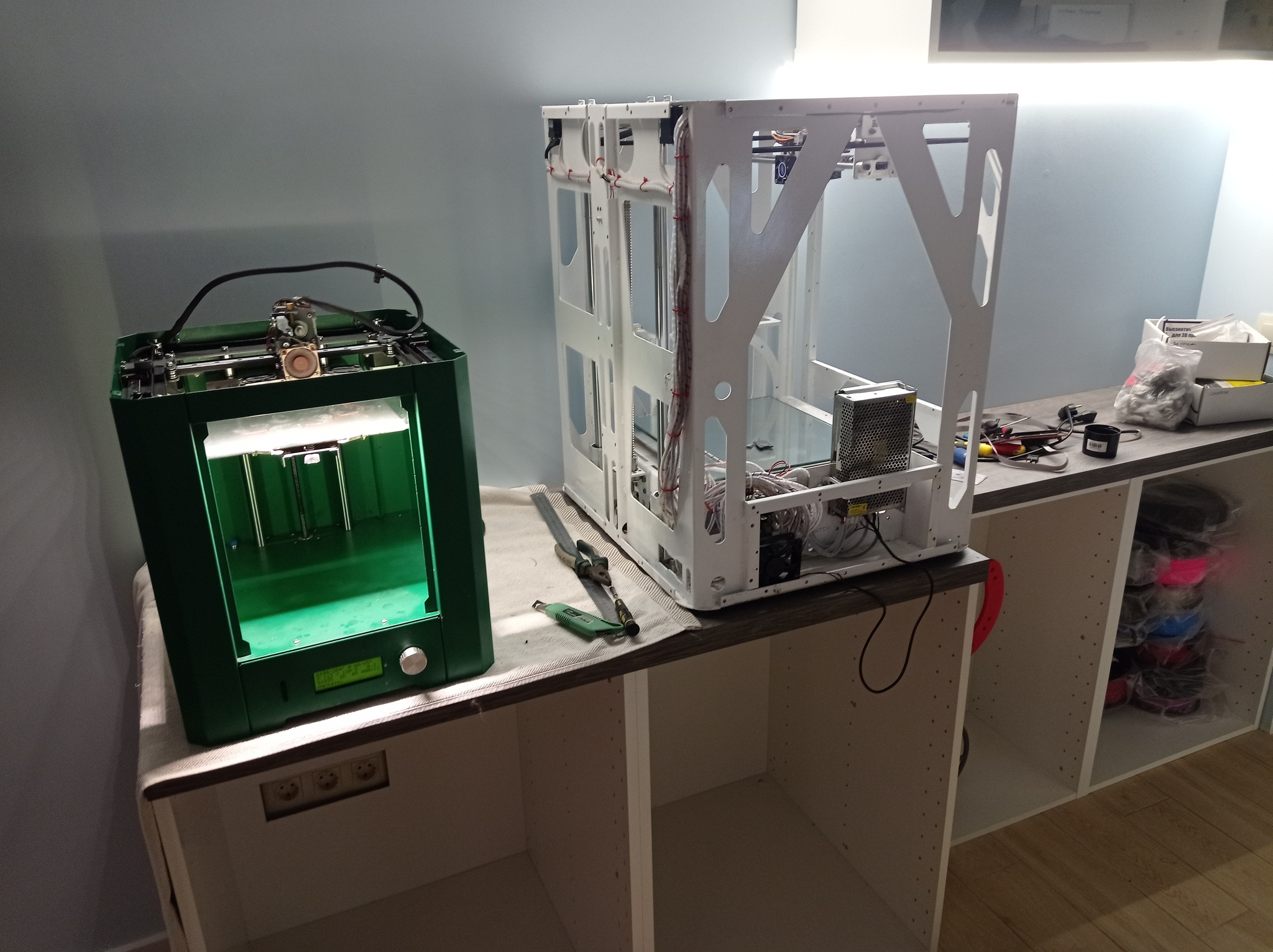 И начну я с обустройства 3D принтерного уголка. Принтера - это важная часть рабочей зоны, даже, я бы сказал, одна из ключевых. Они позволяют в условиях квартиры решать массу задач, от прототипирования до изготовления малых серий рабочих изделий. Они вполне себе активно принимали участие в ремонте - многие детали , разработанный мной, потом на них отпечатаны. Принтеры имеют рад особенностей, которые характеризуют их применение в квартире - во первых, они шумят - конечно, это не фрезерные станки, но ночью, в полной тишине - это еще как слышно. Даже на тихих драйверах. Даже исправные и смазанные. Второе - они требуют место для обслуживания, хранения пластика, ремонта. Под них я отвел половину рабочей зоны - это 2 модуля высотой 80см, шириной 60 и глубиной тоже 60. Выше этих модулей - столешница, и подсветка - это место, куда принтера можно вытащить и с удобством обслужить - почистить, смазать, перебрать - примерно так, как на фото