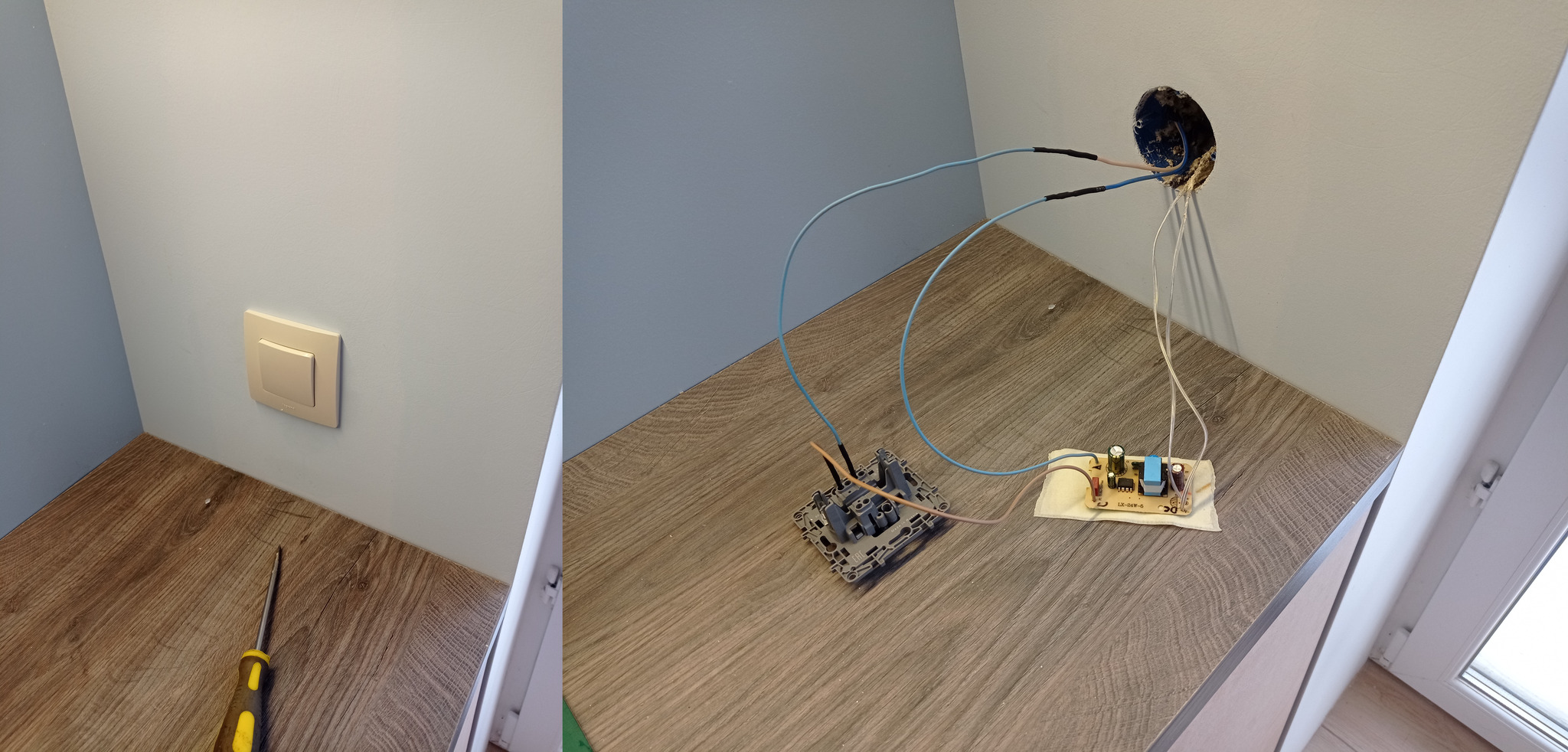 Кстати, примерно в то же время я задался целью сделать подсветку на балконе) Там тоже все было просто - я нашел компактный трансформатор 24в (который правда все равно не влез в подрозетник), снял с него корпус, а саму плату заизолировал, подключил к выключателю и запихнул в подрозетник