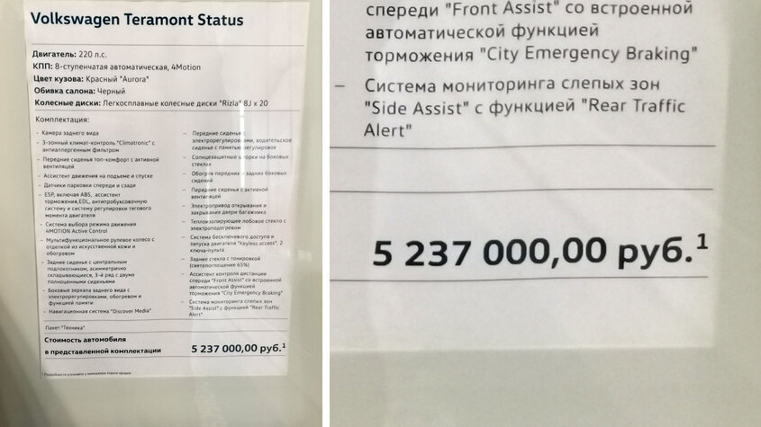 Дилер утверждает, что за время отсутствия на рынке Terramont сформировал большой отложенный спрос, поэтому обновлённые кроссоверы разбирают чуть ли не по любой цене. Машина в исполнении Status должна стоить 4 087 000 рублей. Пакет «Техника» с системой кругового обзора, ассистентом парковки и зеркалами с памятью добавляет ещё 35 тыс., а всё остальное — наценка дилера на шумоизоляцию, сетку в бампере, защиту двигателя и коробки, коврики и фирменные органайзеры, их установку, а также за защитную обработку кузова.