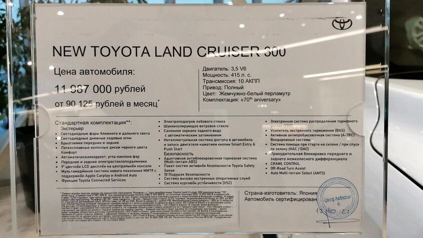 Когда трёхсотка только появилась на рынке, мы поначалу смеялись, встречая в сети предложения о продаже машины за цену больше 10 миллионов. Больше не смеёмся — потому что эти цифры можно увидеть в салонах официальных дилеров. Да, на стенде дорогой Крузак в исполнении 70th Anniversary с бензиновым турбомотором V6, однако официально он должен стоить 7 885 000 рублей. Доплату в 4 млн берут даже не за сеточки, коврики и затянутый в плёнку кузов, а за популярность модели — это тот самый случай, когда спрос очень сильно превышает предложение.