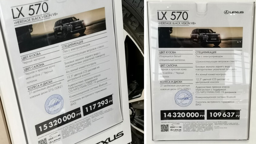 Едва мы успели заснять прайс-листы двух LX570 в старшей комплектации Heritage Black Vision c ценниками в 14,3 и 15,3 миллиона рублей, как оказалось, что обе машины уже проданы. Но дилер тут же предложил похожий автомобиль в комплектации Luxury (8,3 млн) за 13,5 миллионов! Переплата составляет как минимум 4 миллиона, но и дилерский набор заметно богаче, чем в масс-маркете. Например, кузов внедорожника затянут плёнкой, есть тонировка, защита картера, керамическое покрытие дисков, сигнализация, доводчики дверей и даже комплект зимней резины размерностью 21 дюйм на дисках-репликах.