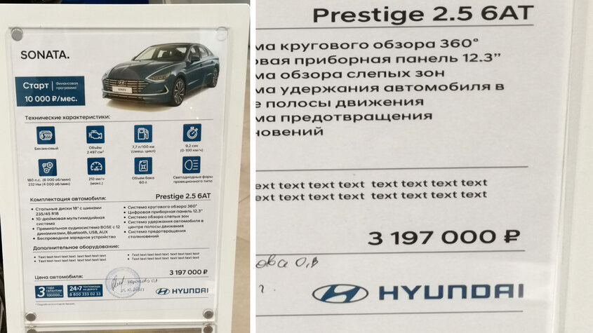 Шаг в следующий сегмент — и наценки становятся ещё круче. Sonata со старшим мотором 2.5 в неплохой комплектации Prestige должна продаваться за 2 504 000 рублей, но у дилера стоит почти 3,2 миллиона, хотя на ней нет вообще никаких фирменных опций. А написать на ценники, за какие допы придётся доплатить, продавец не удосужился — в соответствующем поле лишь «рыба». Мы поинтересовались, за что просят почти 700 лишних тысяч, и были разочарованы: тот же стандартный набор из сетки, ковриков, защиты картера и антикора, плюс сигнализация с автозапуском. И всё!