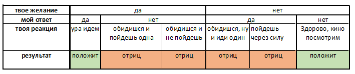 (Я) Вот смотри, мне вообще в этой ситуации невыгодно говорить да или нет, потому что при определенном ответе, я получаю 4 негативных исхода и только 2 позитивных.