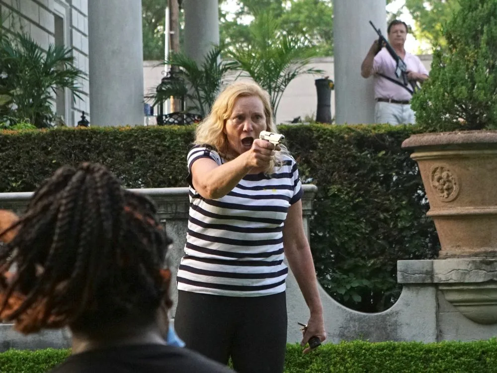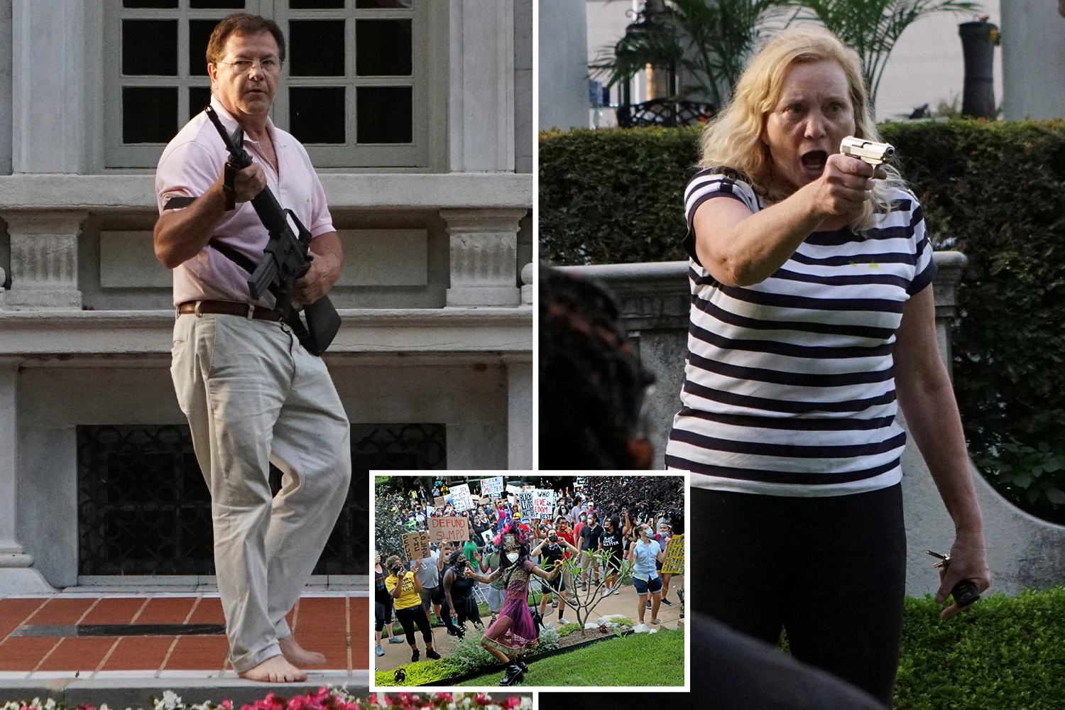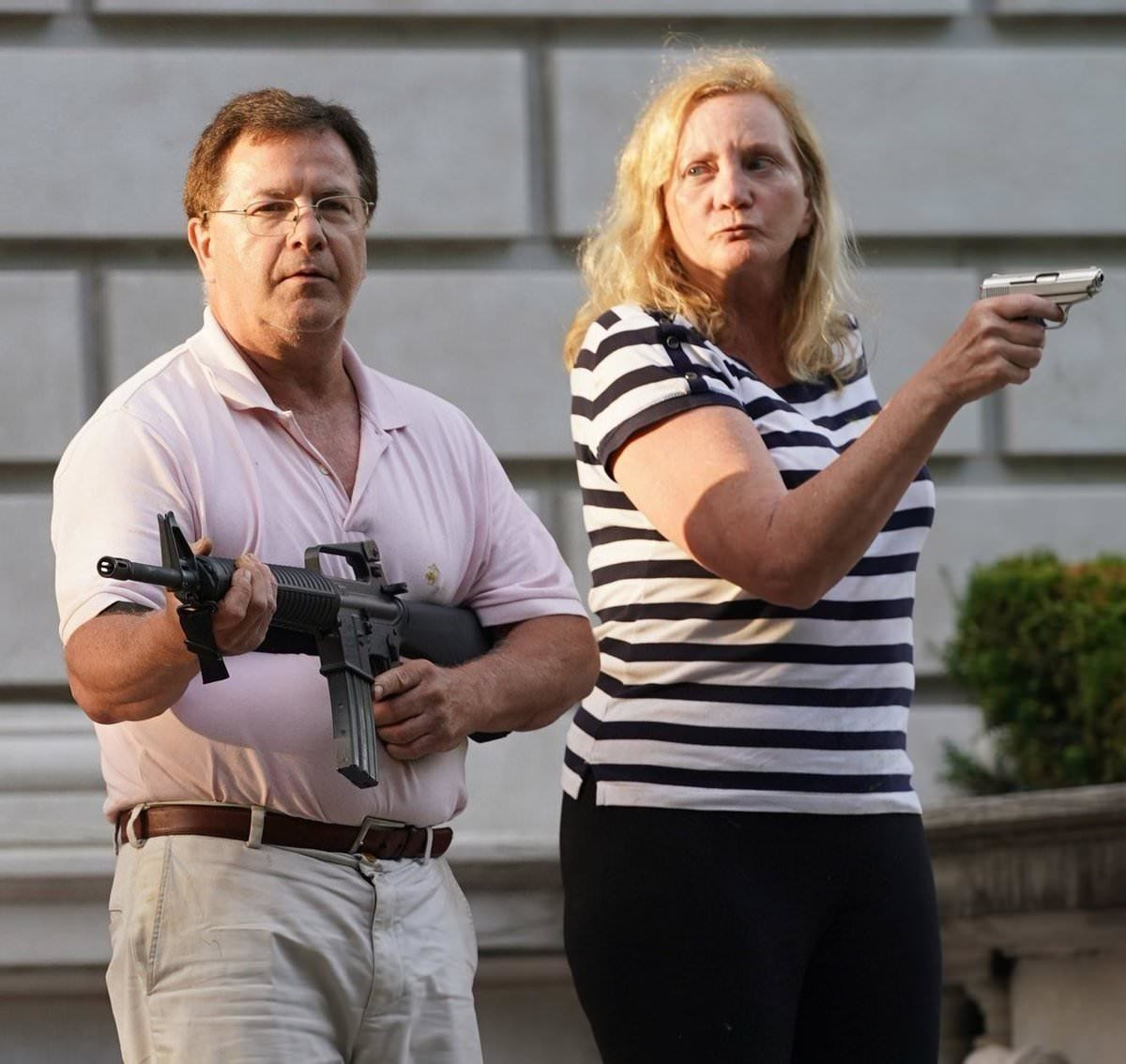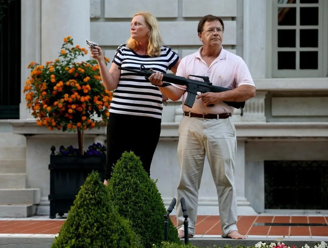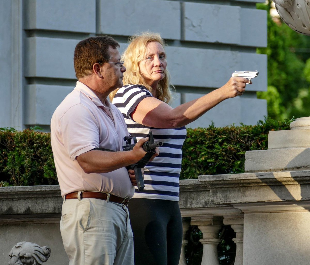 Снимок, на котором Марк и Патриция с оружием на изготовку, стоят на крыльце старинного особняка, стал вирусным. А 60-летние адвокаты всего лишь выскочили на улицу, когда около 300 протестующих сломали ворота их дома, проигнорировав табличку «посторонним вход воспрещен».
