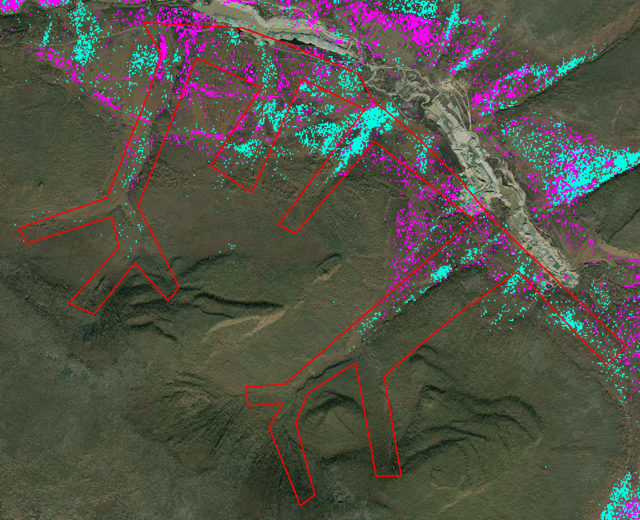 Так вот, вернемся к участку. Возьмем подходящие снимки и рассчитаем прогнозную карту распределения минералов-индикаторов золотого оруденения: сульфиды железа (сюда относится пирит) - на рисунке ниже - пурпурный цвет и минералы трехвалентного железа (магнетит, гематит, лимонит) - на рисунке ниже - бирюзовые. Вот какая красота получается, прям все как в учебнике: